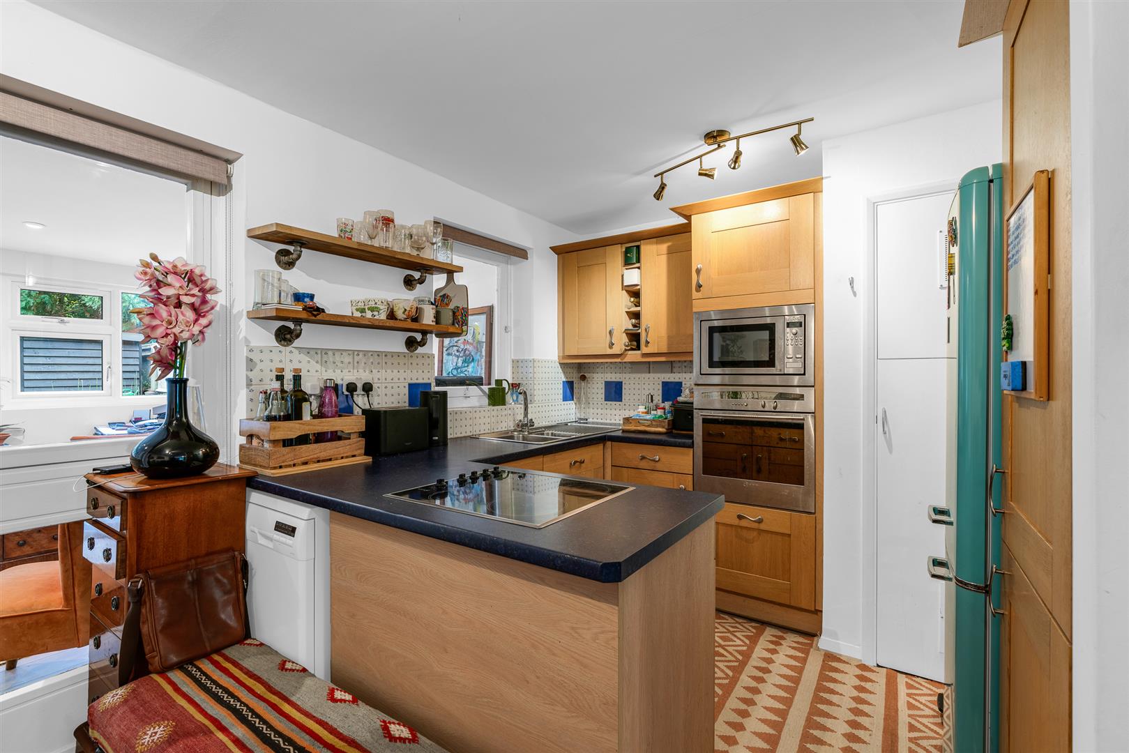 Semi open-plan from the dining area is the well appointed kitchen. Enjoying an intelligent, ergonomic yet stylish design, the kitchen is another light, bright space thanks to its rear facing window and open connection to the dining area. Ample storage is ensured by way of a comprehensive array of wall and floor mounted fitted cupboards, which also house a full complement of all the household appliances any family might need, along with designated areas for additional free standing items.