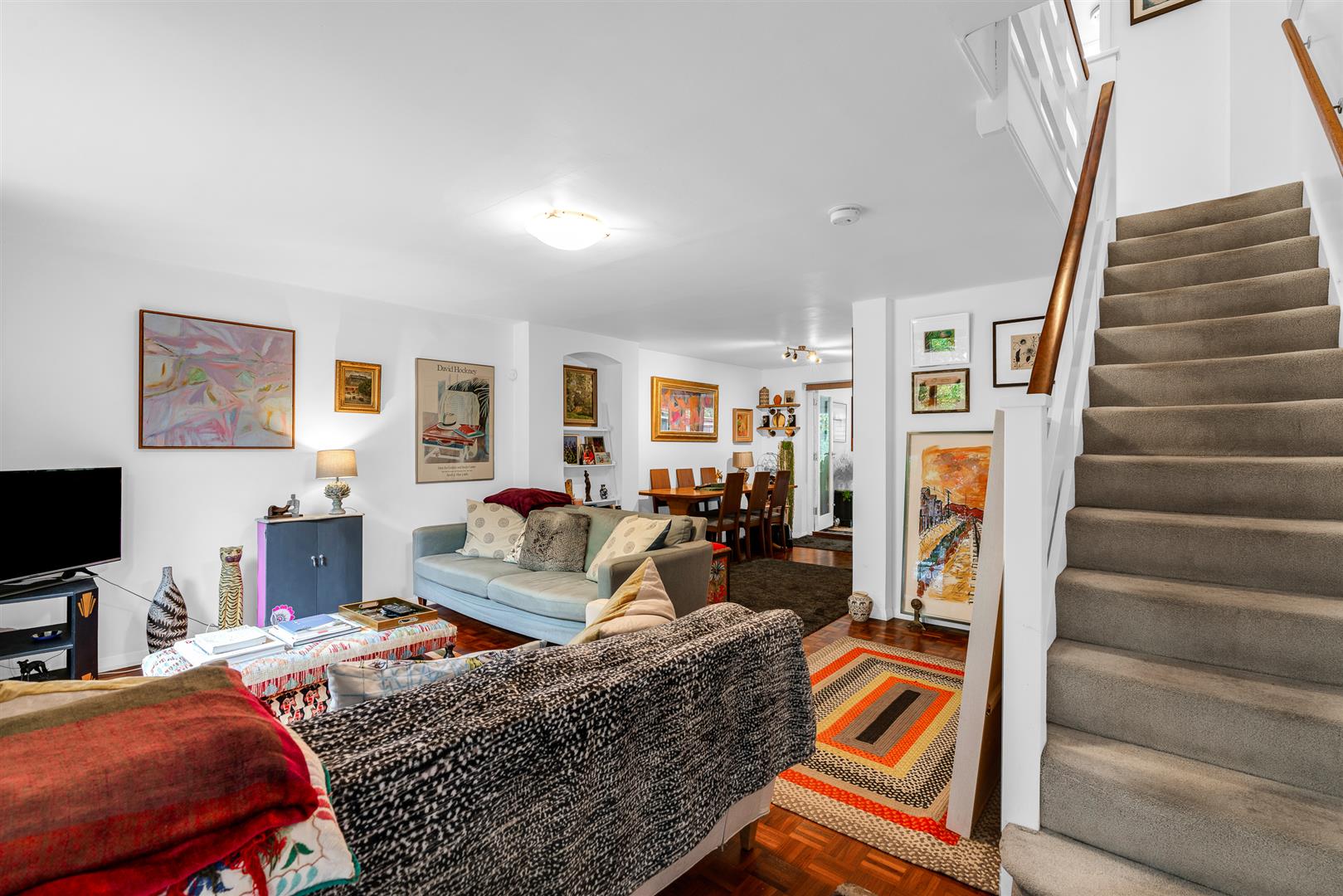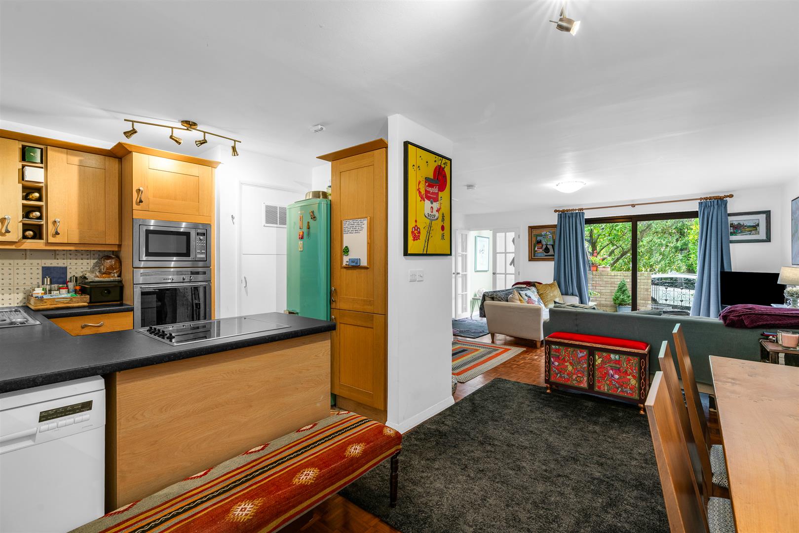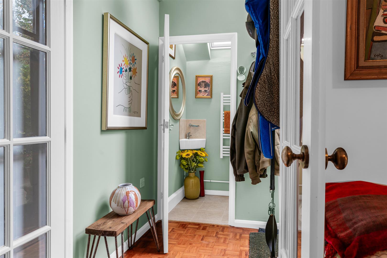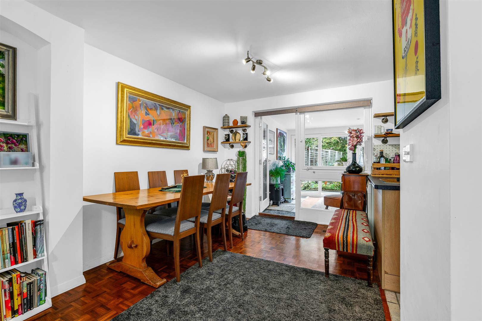 The front door is fully glazed, with a wonderful window above that stretches up into the high pitch of the ceiling of the smart entrance hall. From here fully glazed double doors open into the large lounge/dining room, whilst to the right is a perfectly placed guest cloakroom. Starting at the front door and running right through to the rear of the house is a stunning solid wood parquet floor, arranged in the classic mosaic style, which brings a wonderful warmth and elegance to the room.