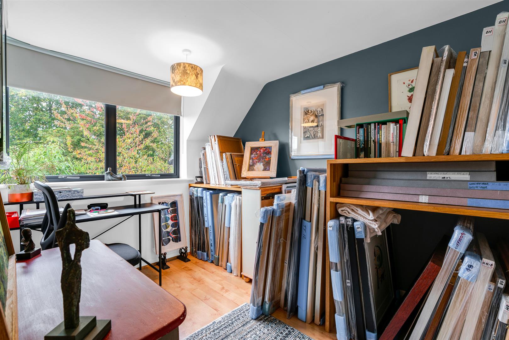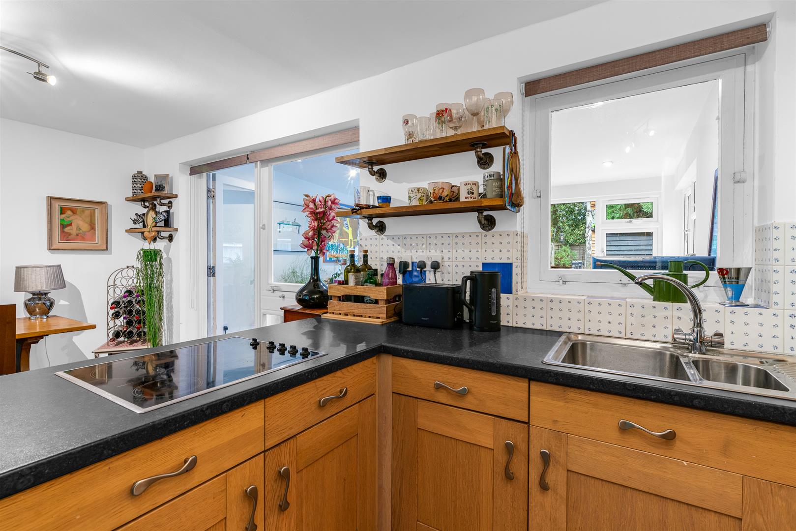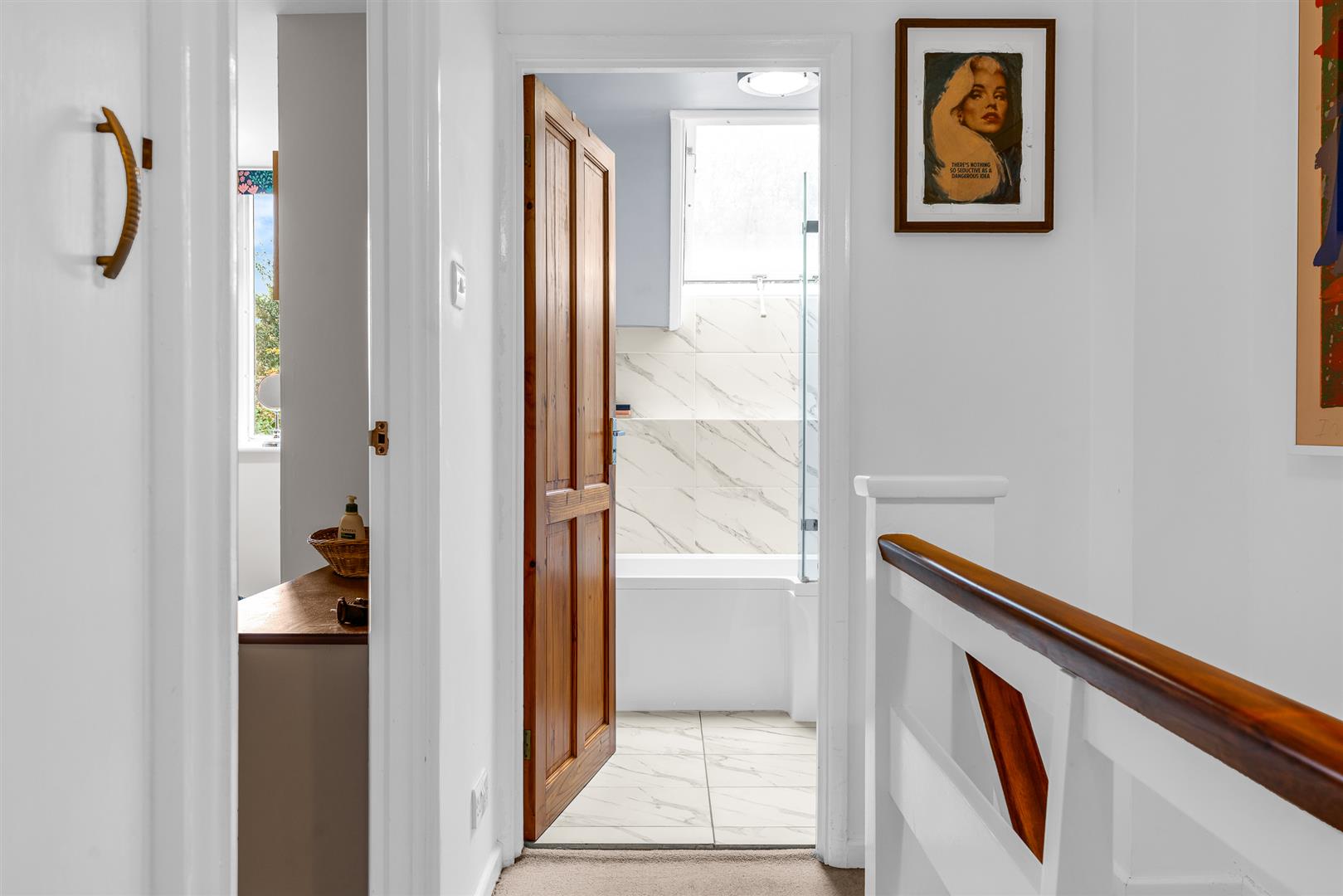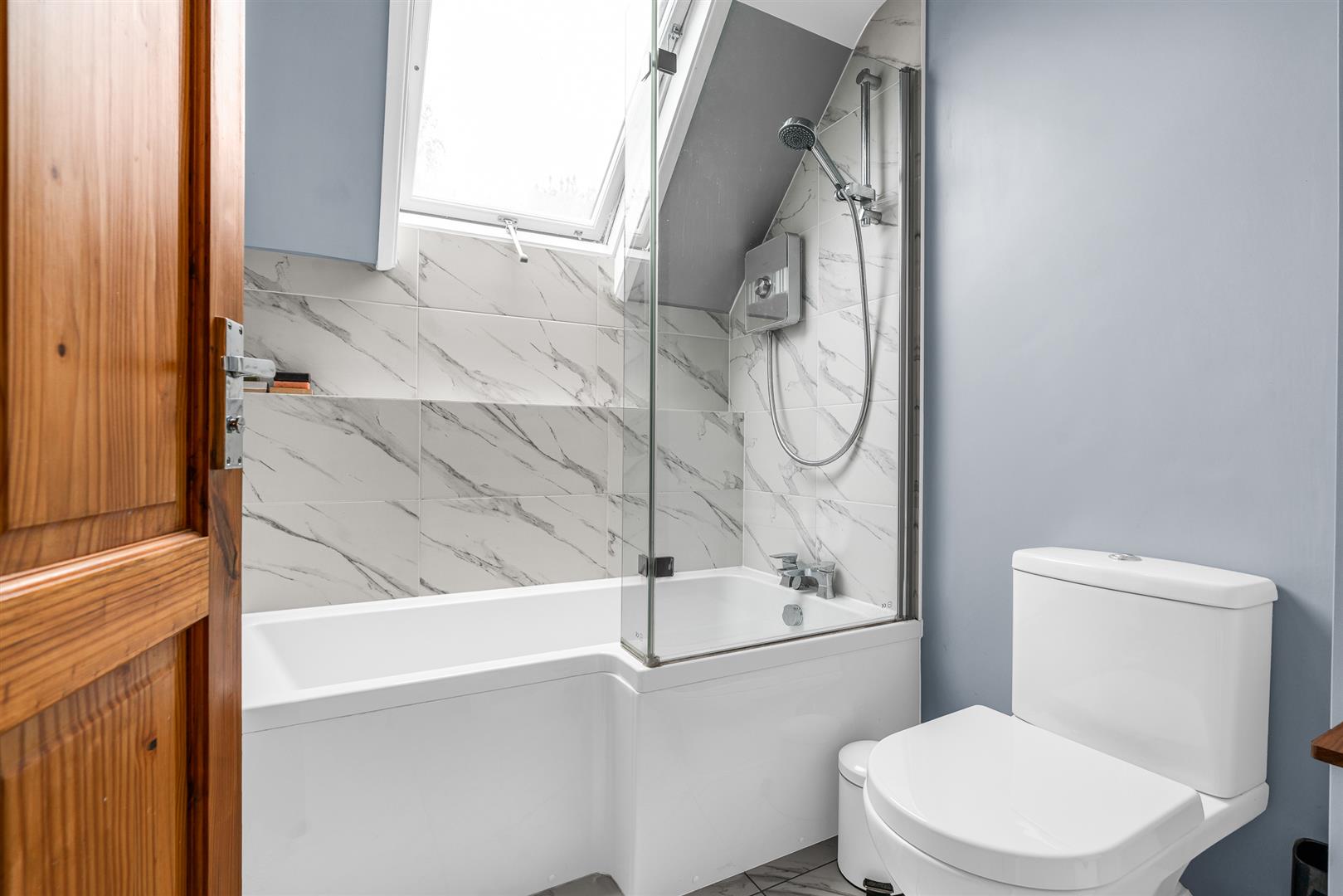 Upstairs are the three bedrooms, two of which have large fitted wardrobes and are still comfortable doubles in size, and enjoy wonderful light through their large picture windows. The family bathroom is smart and elegant, with a separate 'P' shaped bath including a shower fitting and screen set beneath the generous roof light illuminating the space.