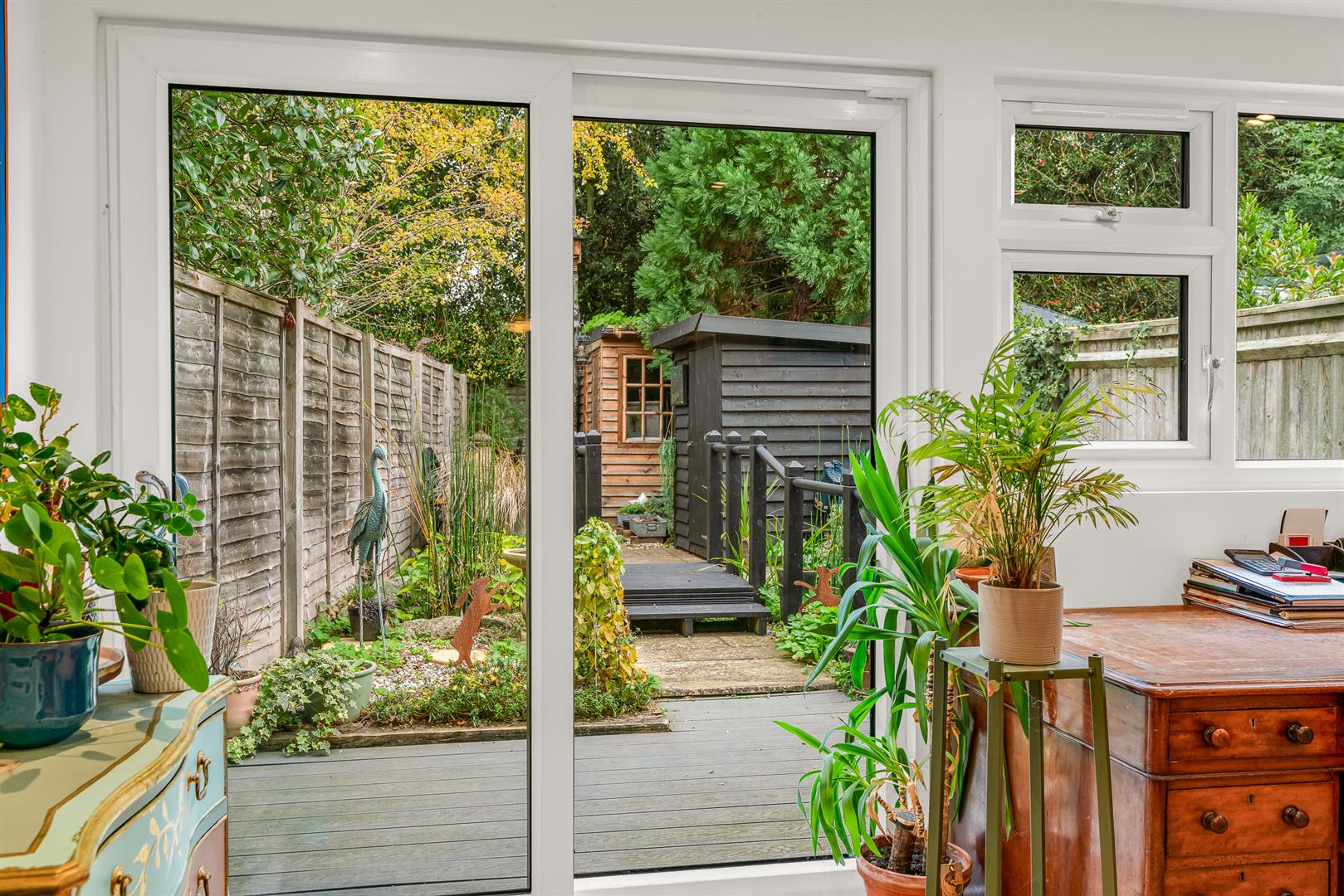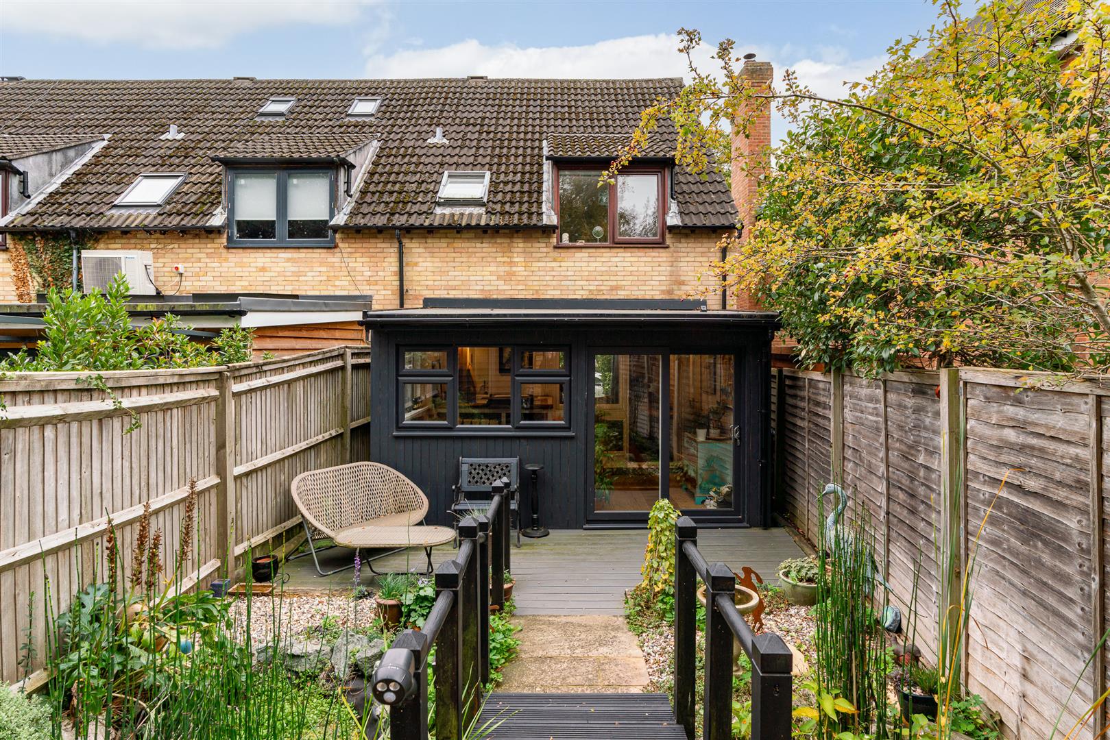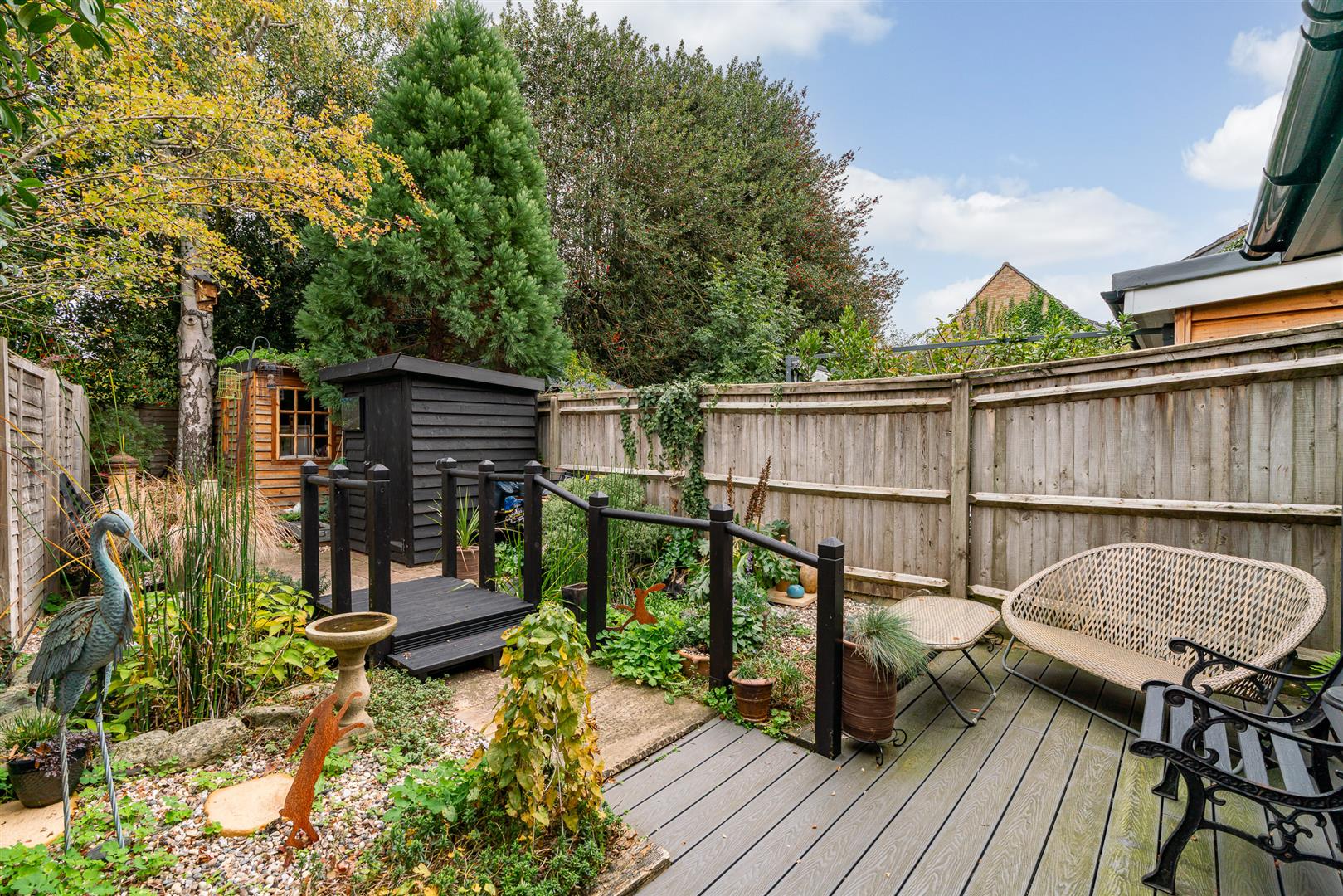 To the rear the enclosed and sheltered garden has been creatively landscaped to offer a stylish and attractive space in which to relax and enjoy time with family and friends. A large decking area runs across the rear of the family room, with a path and small wooden bridge extending through a Mediterranean garden and over a lovely water feature filled with a varied display of specimen plants, bushes and shrubs. The garden enjoys a super, open aspect, and being fully secure makes it ideal for children and pets. To the rear of the garden is a useful shed, with the delightful summer house nestled into the corner.