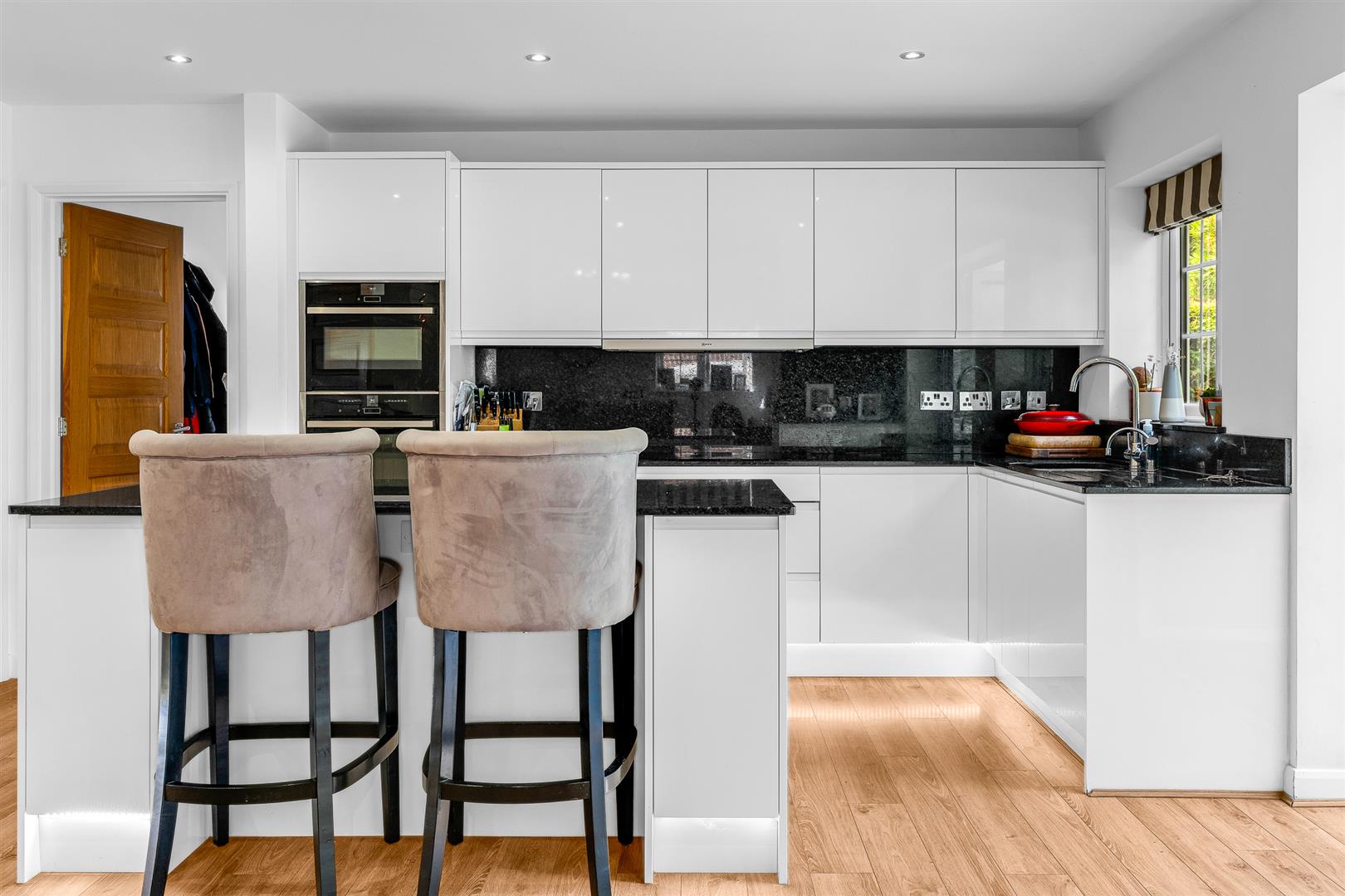 The kitchen is simply fabulous, with a comprehensive array of gloss white wall and floor mounted cupboards providing substantial storage as well as housing a full complement of integrated appliances. Further enhancing the storage and worktop space is a super island, which acts as a stylish visual delineation of the space whilst also serving as a terrific breakfast bar. An additional rear window joins the bi-fold doors in flooding the space with daylight, with the uninterrupted flow through and around the room making it the hub and heart of this lovely family home. Adjacent to the kitchen, conveniently located off a lobby area that also leads to an external door opening into the rear garden, is a well specified utility/laundry room allowing you to keep the main kitchen clear and clutter free.