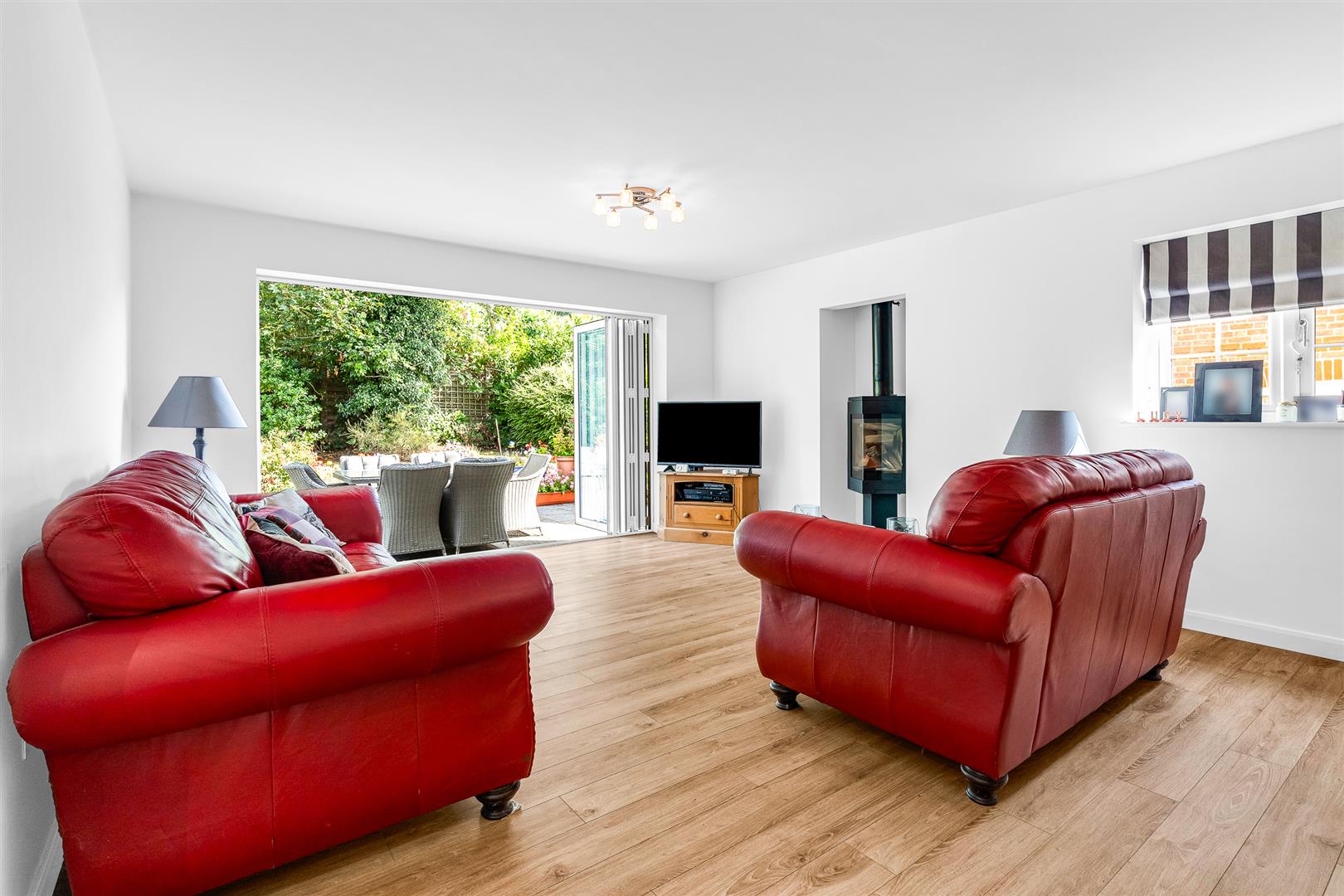 Adjoining the kitchen on the other side, with a splendid free flowing open plan connection through to it, is the living/dining room. This is a large room by any measure at over twenty-three feet long, but despite its size the well proportioned space stays light and bright throughout the day thanks to the rear facing bi-fold doors and a further window to the side aspect. A delightful modern log burner acts as an attractive focal point set into a recess in the outside wall, with the rest of the room providing a generous and flexible blank canvas for you to configure and furnish in the way that best suits your lifestyle. Multiple sofas and chairs will be easily swallowed up and still leave more than ample space for a large family dining suite, with the unfettered access out into the garden being a real boon for both day to day living and when entertaining family and friends.
