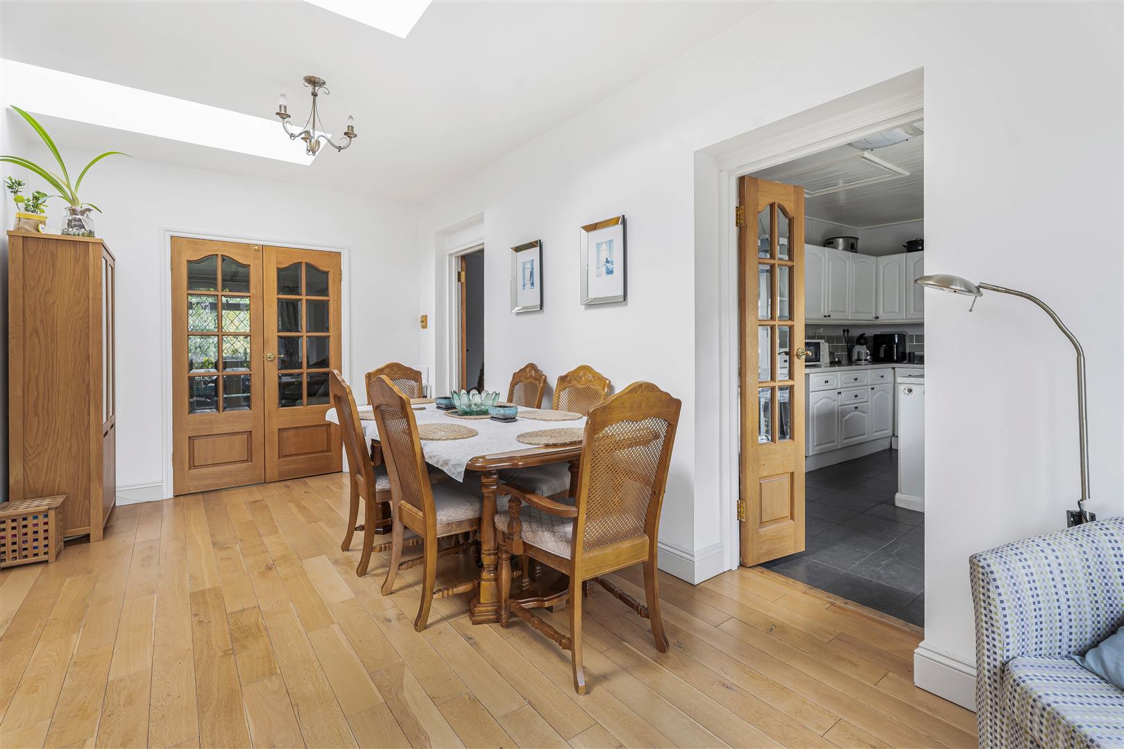 To the rear, the dining room has part glazed double doors leading in from the reception room and the kitchen as well as the living room, and also links seamlessly out into the garden via a lovely pair of leaded light French doors complete with matching side panels. This is a delightfully light and bright space, made even more so by two roof lights along its length, which also help the natural light to permeate through into the interconnected rooms around it. At nearly eighteen feet long this is certainly a substantial room that will happily accommodate a large dining suite and other occasional furniture besides, whilst still leaving plenty of open floor area for easy movement in and around the room.