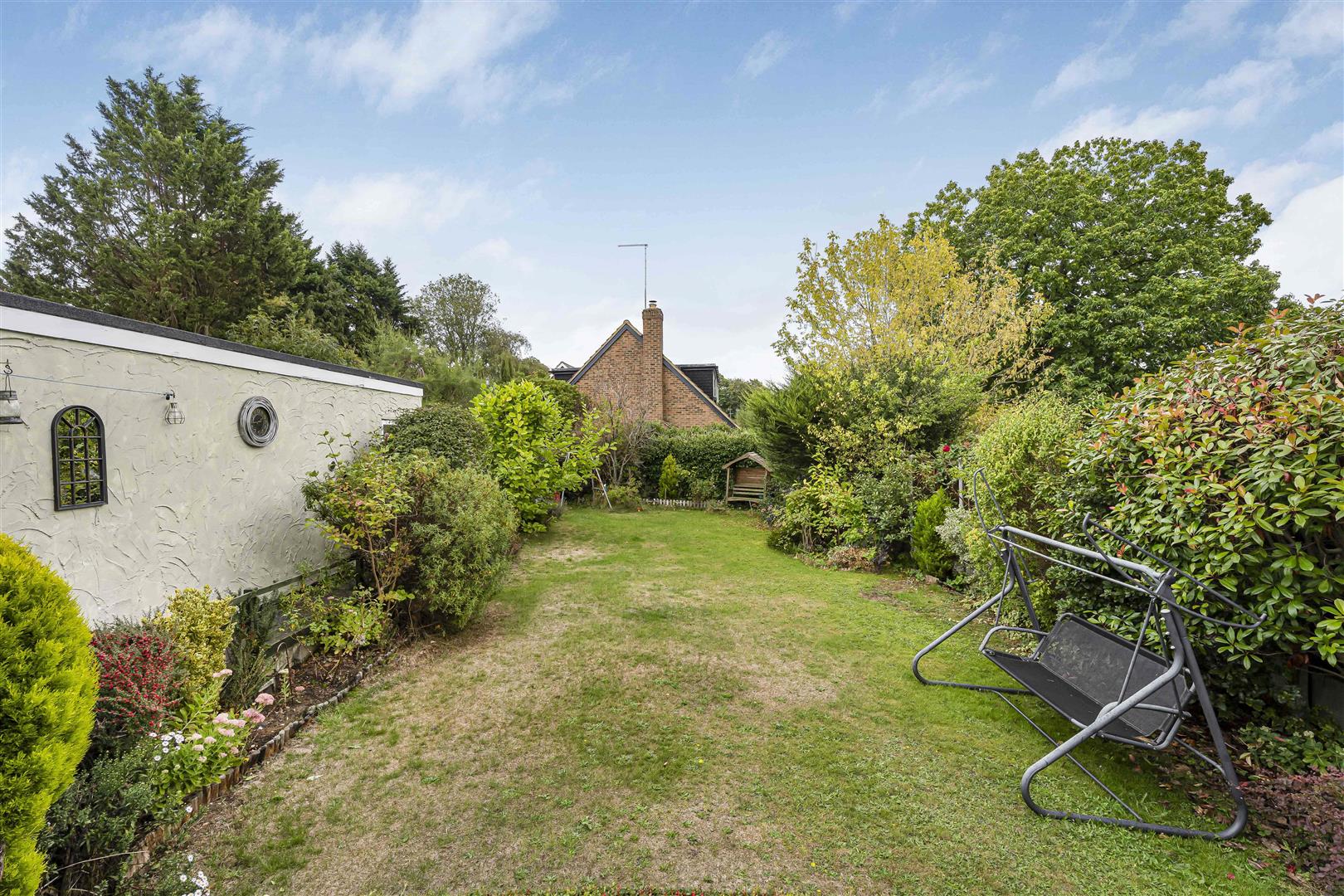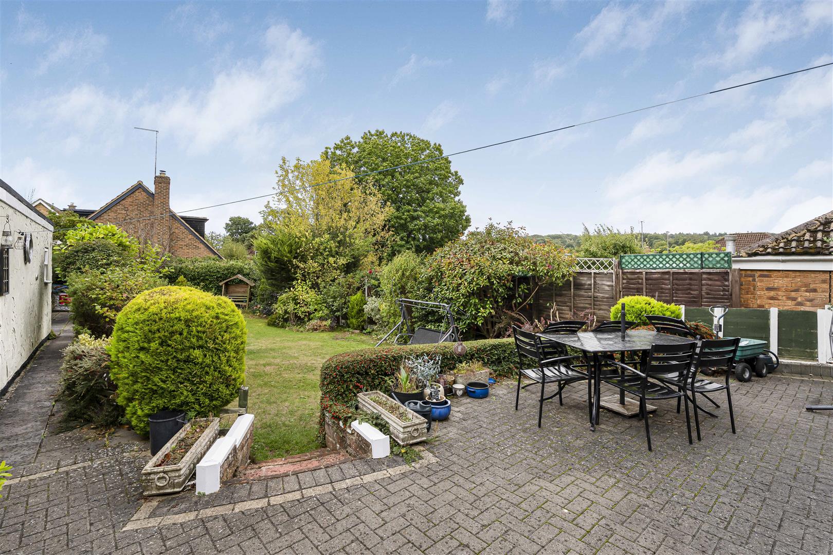 The capacious frontage is well screened from the road by mature hedges and trees, and is comfortably large enough to provide ample parking for family and visitors alike. A driveway extends the full length of one side of the house, offering even more parking as it leads through to a double tandem garage at the rear. There is convenient pedestrian access along both sides of the house and on into the rear garden, which is secure and enclosed and so ideal for pets and children. At the rear a large block paved patio forms a terrace across the full width of the property, nicely linking all of the access points into the utility/laundry room, the kitchen/breakfast room and the dining room, making this a great place for entertaining guests. Alongside the garage is a paved path that leads to multiple sheds and storage areas, whilst a few steps lead down from the patio onto the large lawn. The lawn runs the full length of the garden, surrounded by deep borders with a wide variety of plants and shrubs and a few modest specimen trees. This is a good sized garden, but seems even larger than it is thanks to the open aspect offering far reaching views from the terrace. A terrific place to spend time relaxing together as a family, or dining al fresco with friends.