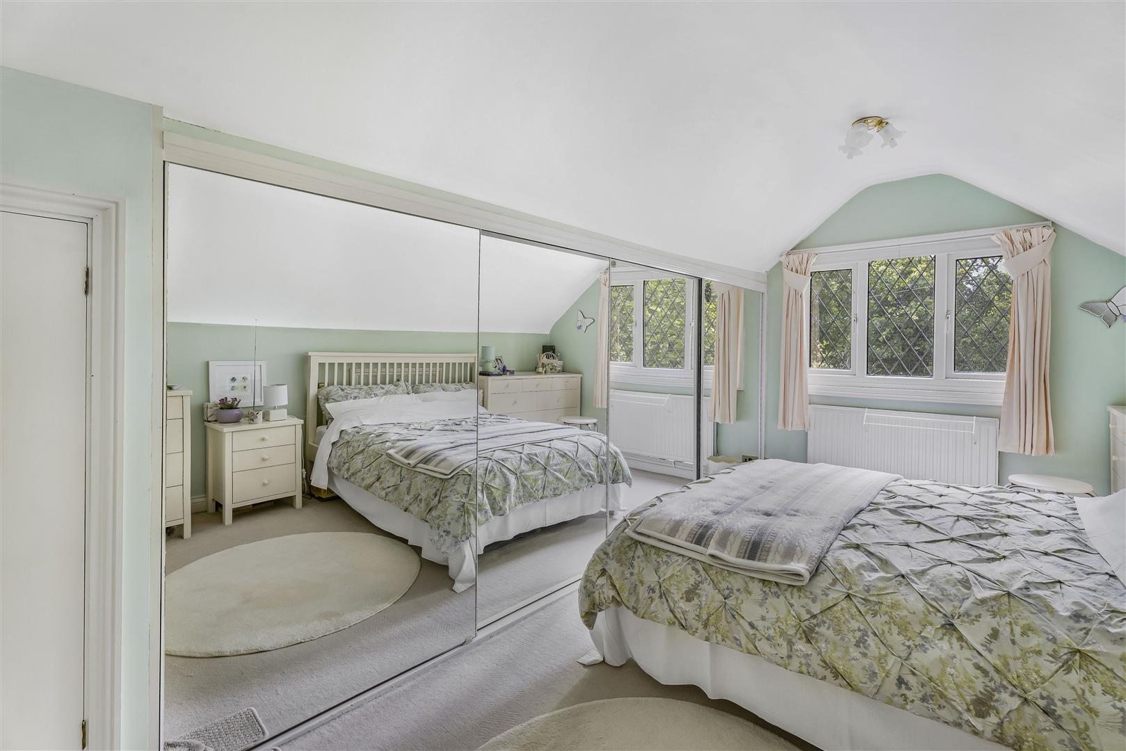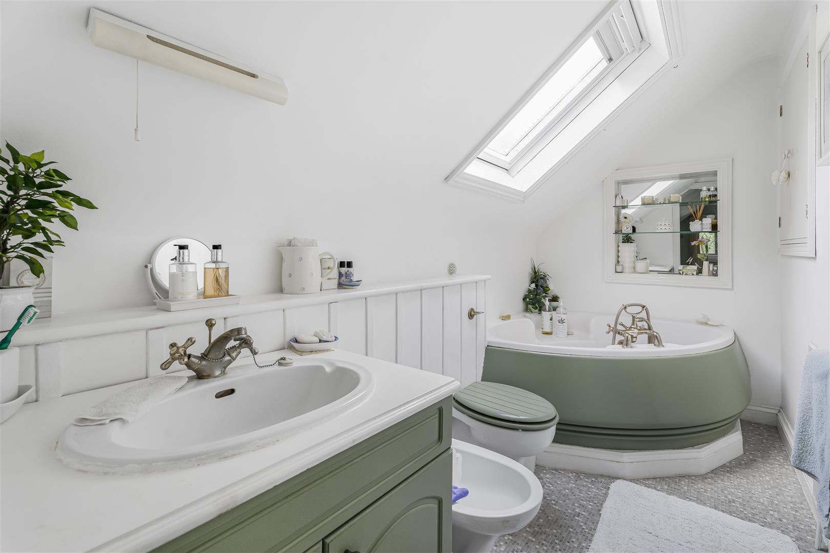 Upstairs is a delightful bedroom that enjoys a high ceiling extending into the open pitch of the roof, along with a full wall of fitted wardrobes. The en suite bathroom is a joy, abundantly lit by a velux window in the ceiling, with a four piece bathroom suite that includes a corner bath.