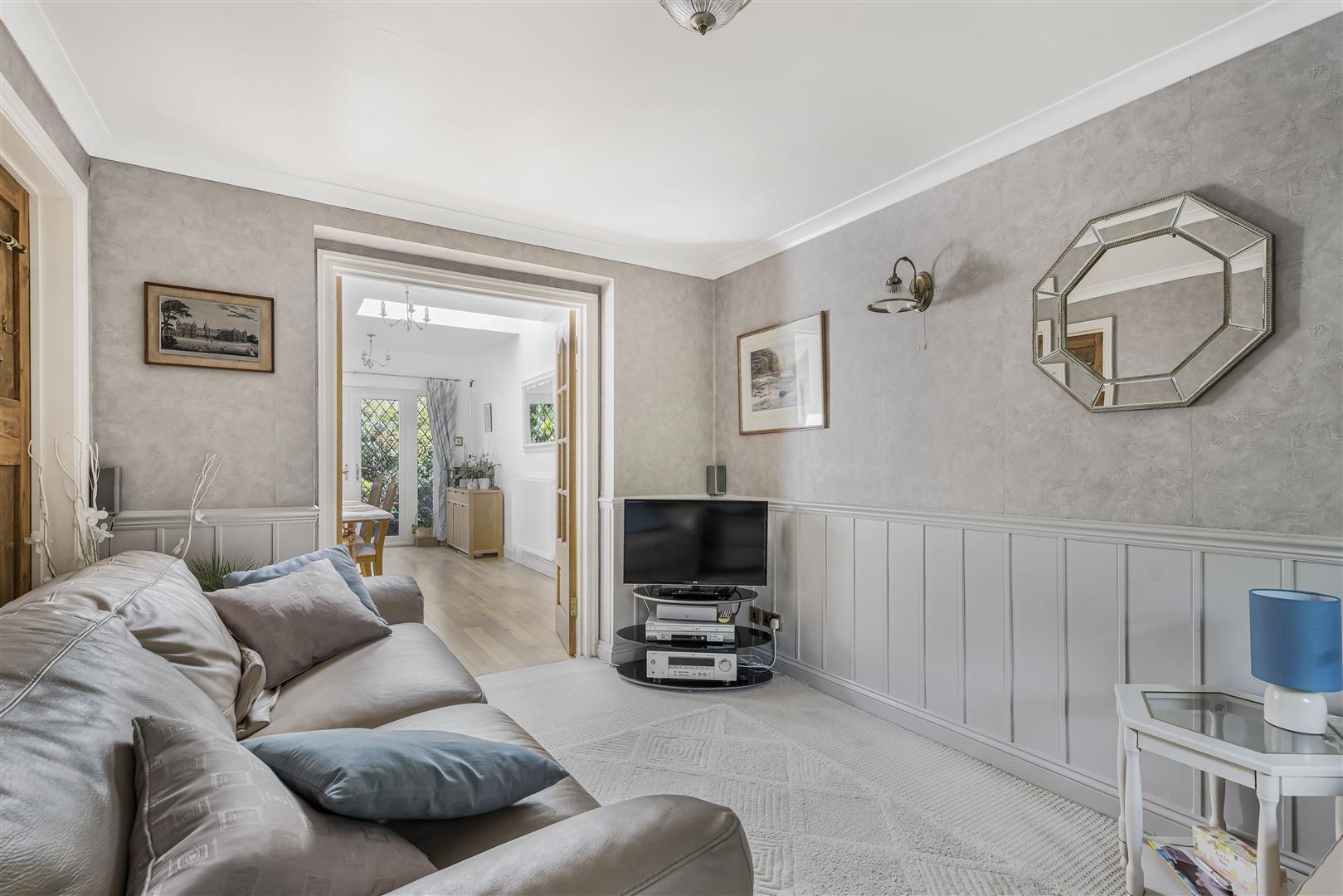 The main living rooms have a lovely open flow around and between them, all connecting to each other, and separately out into the central reception room. This starts with the front facing living room, which is abundantly lit by a large window overlooking the front garden, and has part glazed double doors into the adjoining dining room at the rear. The room has plenty of space for a number of sofas and chairs and is nicely styled with low level decorative panelling running around the full perimeter of the walls.