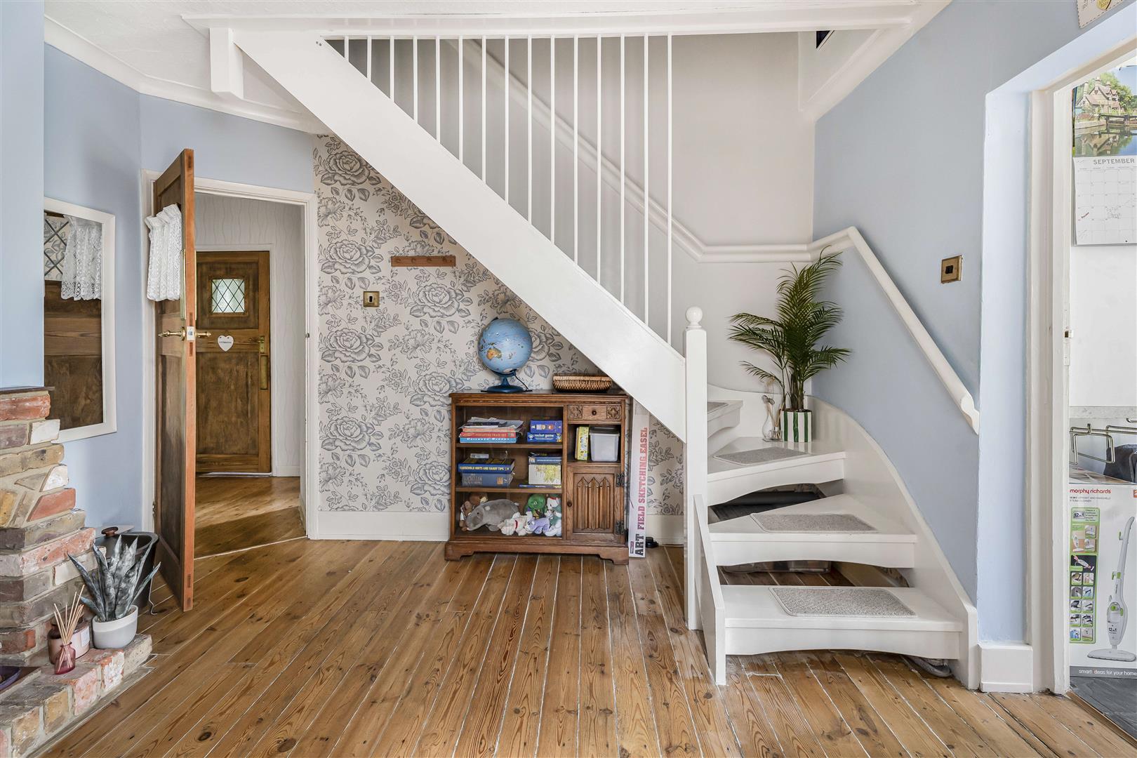 This is an attractive house, with a classic style tiled roof porch providing a welcoming and useful lobby area, surrounded by large leaded light windows that match all of the other windows in the house. Within, a further part glazed door opens into an entrance hall with a superb stripped wood floor, which leads back through the house, passing as it does so the three ground floor bedrooms and the family bathroom, which is ideally placed to also serve as a guest cloakroom. To the rear of the entrance hall a door opens into an inner hall that feeds into the main day to day living areas as well as accessing the fabulous modern open tread staircase that turns as it it rises up to the first floor bedroom suite. Blessed with an imposing exposed brick fireplace and a continuance of the stripped wooden floor from the entrance hall, this is more of a reception room than a hallway, a perfect place to welcome your guests and a neat design layout that subtly separates this living area of the house from the sleeping area to the front.