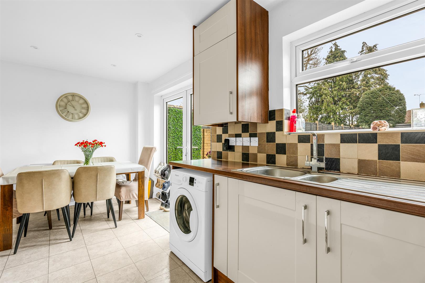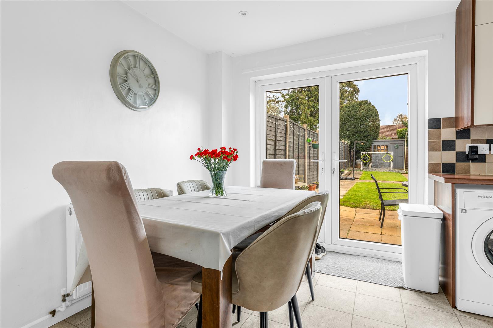 From the living room a door leads through into the open plan kitchen/dining room which runs the full width of the rear of the house. Again this is a room blessed with high levels of natural light thanks to the window in the kitchen area and the fully glazed double doors that provide a seamless connection for the dining area out onto the rear patio. One end of the room has been intelligently designated as the working kitchen and is blessed with a comprehensive array of wall and floor mounted cabinets fitted around three of the perimeter walls in a stylish combination of white doors and wood effect frames and worktops, with a tonally matching matrix of tiles filling the splash back areas to create a really appealing impact. There are a number of appliances integrated within the cupboards, along with a planned-in space for a free standing washer/dryer, making this a really practical and capable family kitchen with ample storage and worktop space. The remainder of the room is left as open floor area, with plenty of free space for a family dining table alongside the fabulous French doors, and an additional useful cupboard built in beneath the staircase.