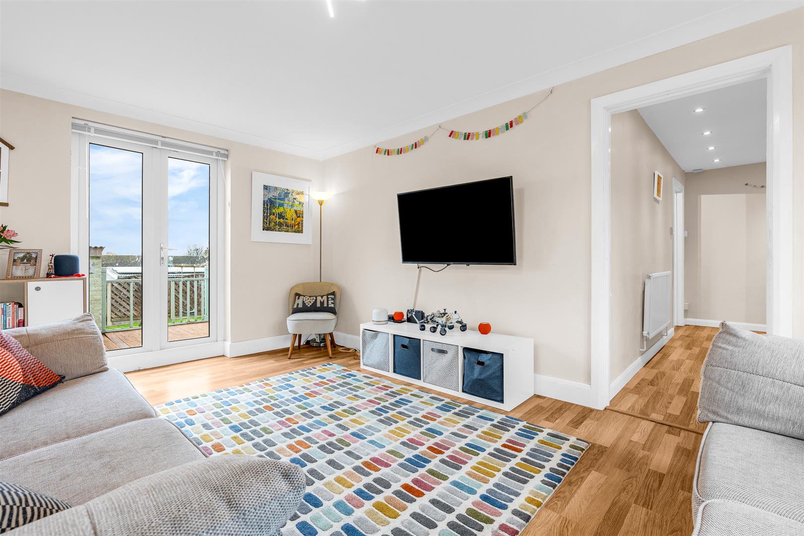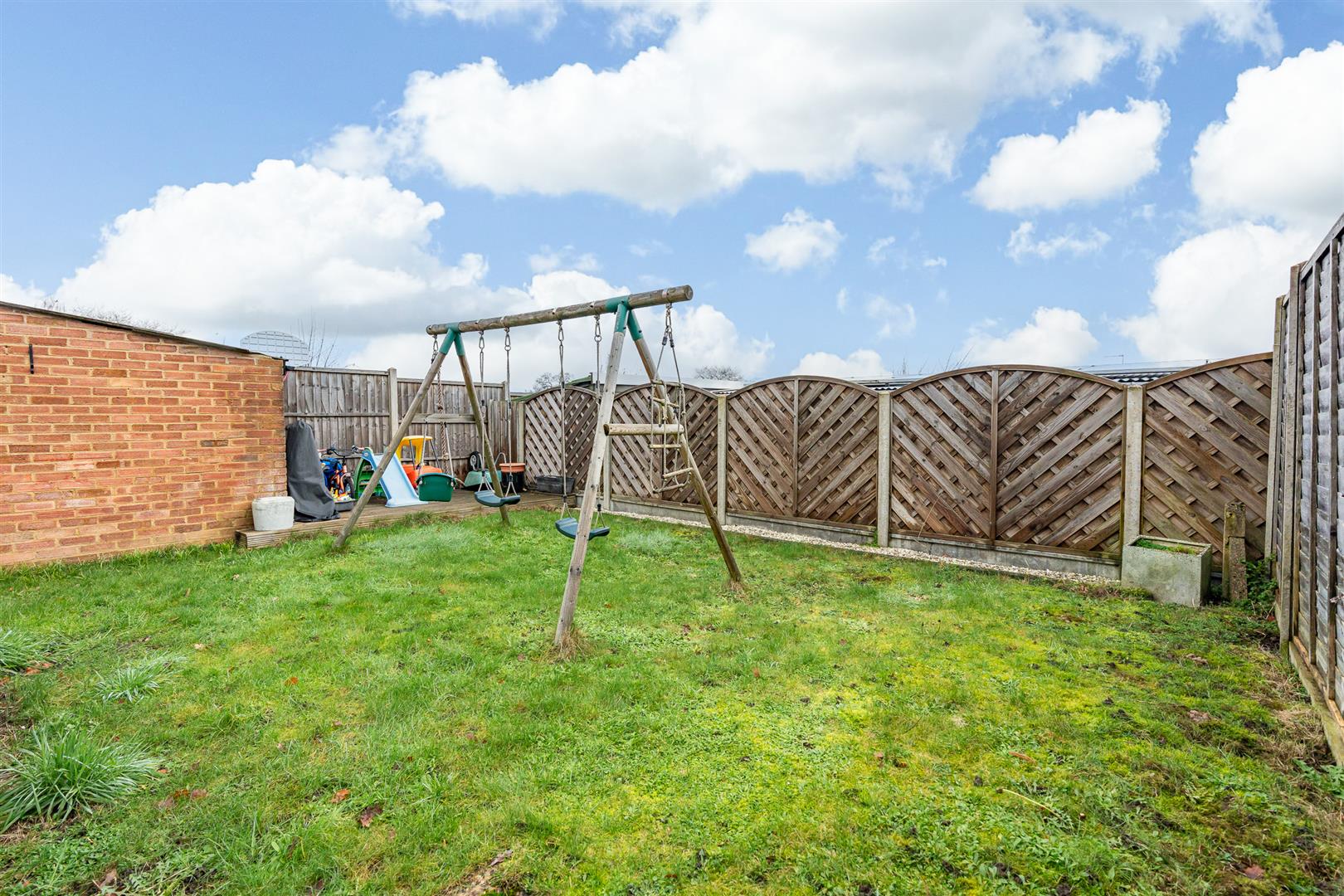 There is useful off-street parking on the block paved frontage, with a covered walkway running from the front to the garden at the rear, which is ideal for pets and children as it is fully enclosed and secure. A fabulous raised decking terrace runs the full width of the rear of the house, creating a wonderful place for outdoor casual seating and dining furniture, and neatly linking the access points in the kitchen and the living room, before leading down a graduated ramp to the grassed area beneath. The rest of the garden is open lawn, with attractive scalloped fence panels across the rear boundary and another area of decking in the corner, in front of which is a brilliant brick built storage room. This is a great garden all round, covering all the bases for children playing safely whilst the adults relax and enjoy the company of family and friends.