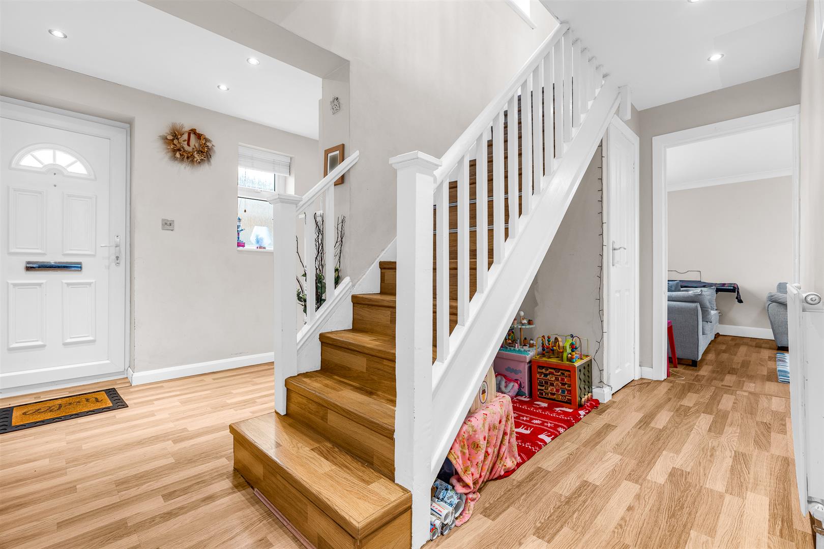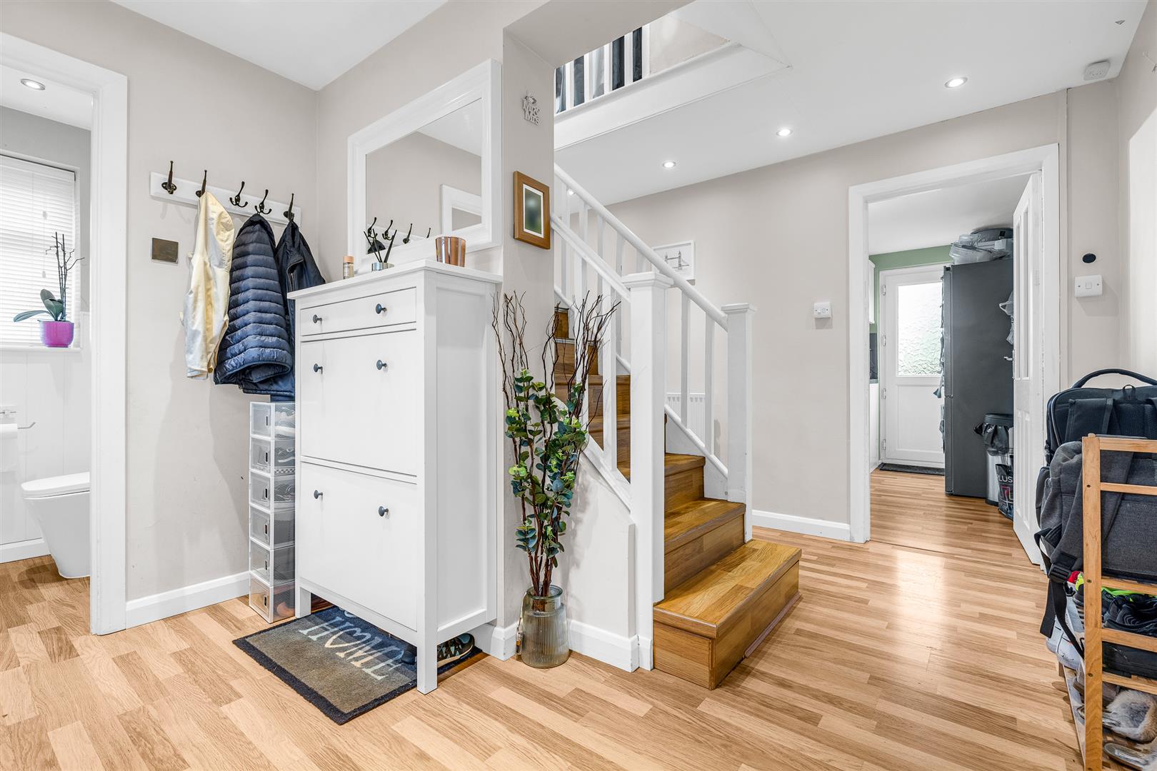 The neat frontage includes a block paved L shaped driveway that allows off-street parking for two cars as well as pedestrian access to the pretty front door. Within is a very large reception area that ensures a warm welcome to all of your visitors, complete with its own front facing opaque window. From here there is a door into the perfectly placed guest cloakroom, also with its own window, and an open connection to the spacious inner hallway beyond the stairs. The inner hallway gives direct access into the kitchen/dining room and an open entrance into the large living room, as well as a useful cupboard set beneath the attractive staircase. There is a lovely open feel to this house which benefits from an intelligent design that makes the absolute best use of the generous space available, also allowing the light from the well placed windows in the upper and lower hallways to flow freely around the surrounding rooms.