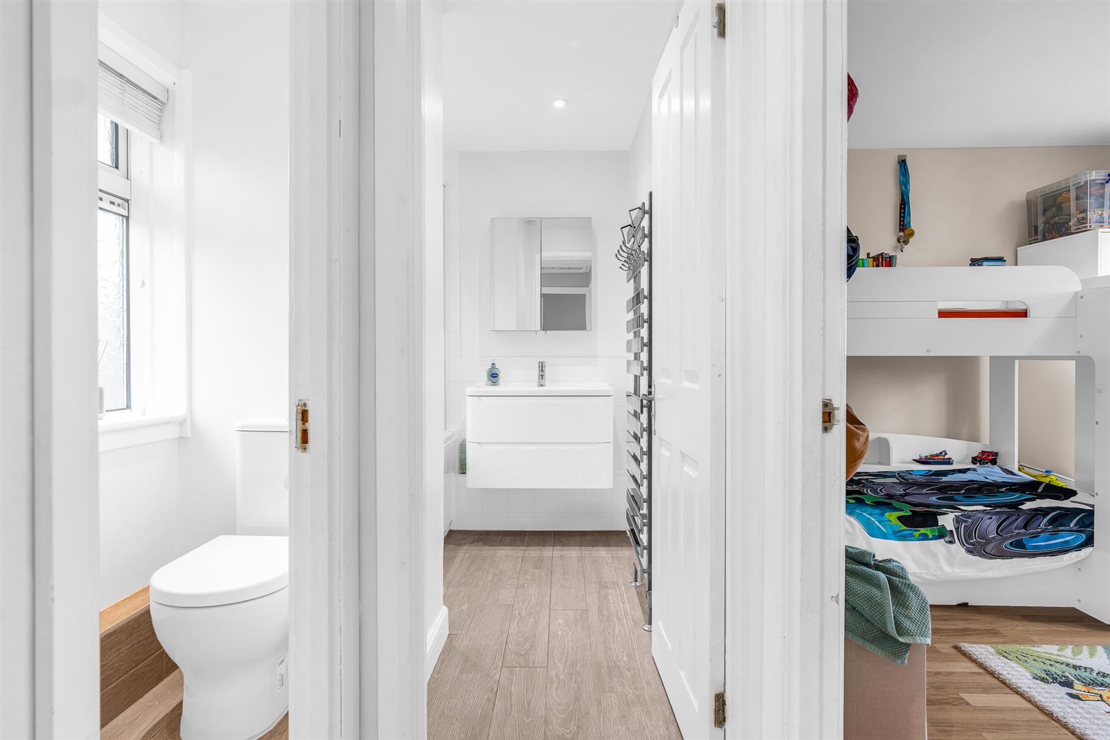 Upstairs is a lovely light and airy hallway, with a large front facing window, attractively galleried over the stairwell, that leads to the three bedrooms, the family bathroom, and the cleverly separated WC with hand basin. Two of the bedrooms are generous doubles, with the principal bedroom benefiting from fitted wardrobes.