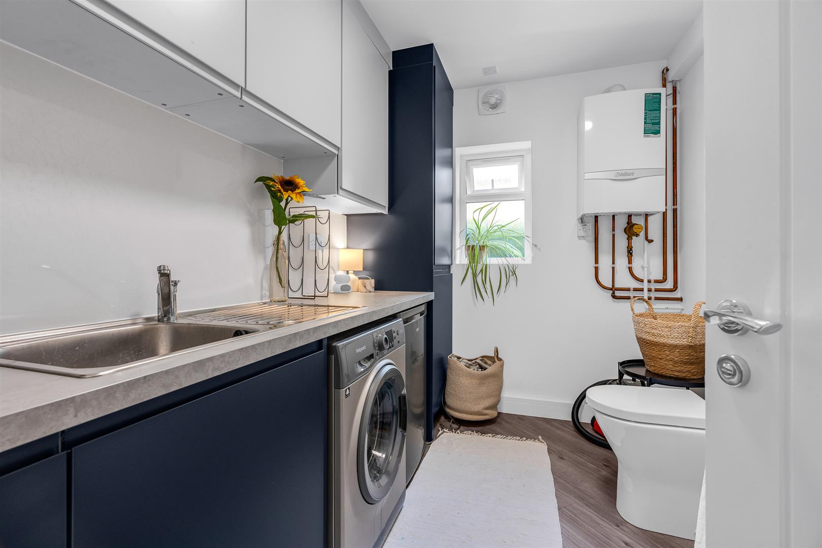 Across the hallway from the study/office is a utility/laundry room ideally placed to augment the main kitchen, which doubles up in fine style to provide a convenient guest cloakroom.