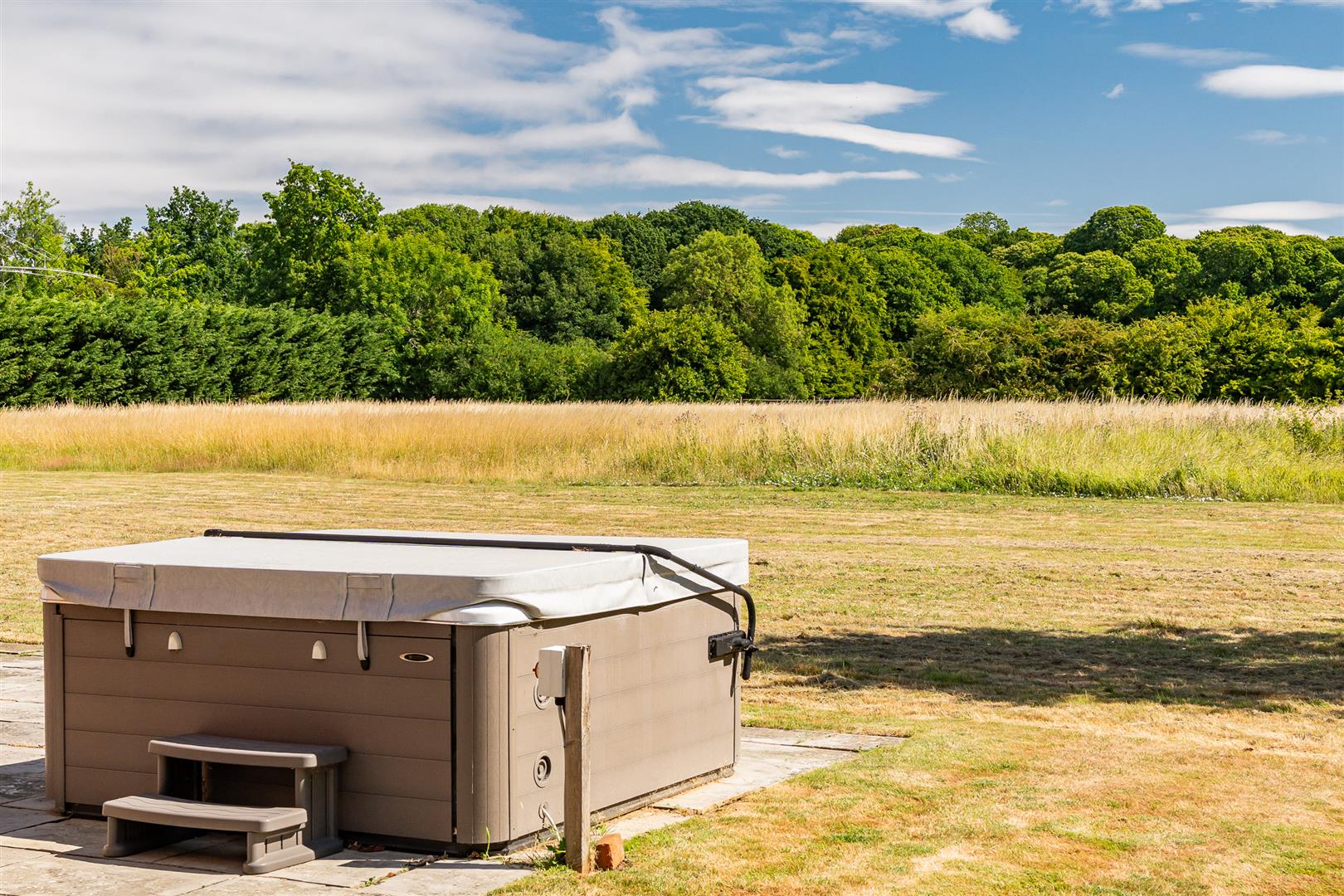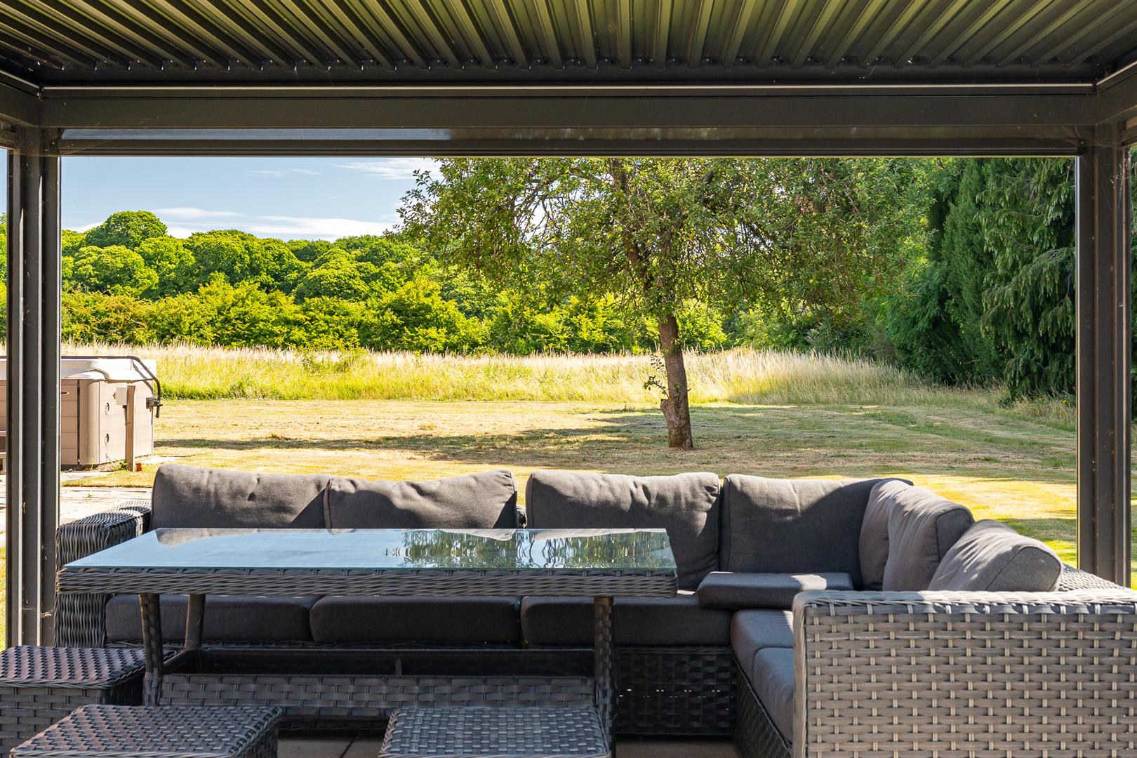 The secure gated driveway sweeps up to and beyond the house, opening into a large parking area in front of the triple garage. The garage is fitted with electronically operated doors and benefits from a pedestrian entrance which can be secured separately from the entrance to the annexe above. The annexe would give great service as an office, arts and crafts studio, teenage hang out space or a cool bar, but has a shower room and could easily be reconfigured with a kitchenette to provide independent living space if required. A large paved patio runs across the rear of the house, linking the garden nicely with the living room and dining room, and there are separate patio areas spread about for eating and relaxing, with one of them shaded by a modern steel built pergola, as well as a superb outdoor kitchen area. The rest of the grounds are open lawn and meadow, surrounded by natural borders of hedging, bushes and trees with countryside views reaching far into the distance.