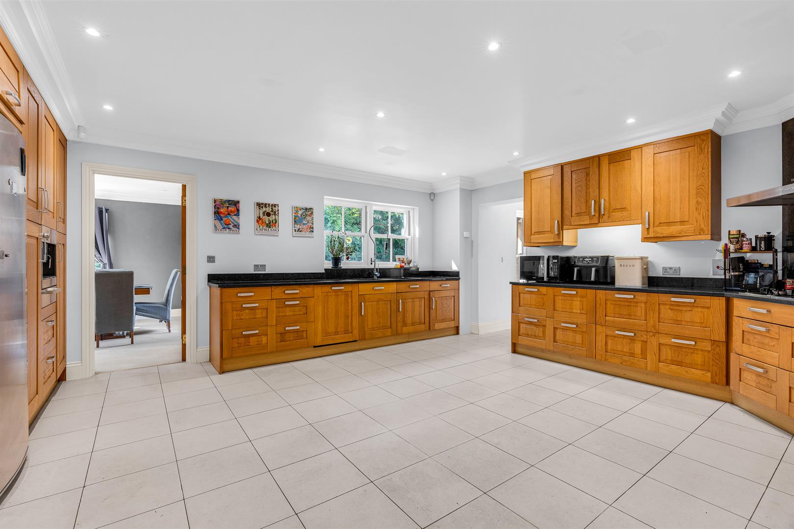 The centrally placed kitchen is ideally situated in between the main living rooms, whilst also directly accessed from the entrance hall. This is a large room by any measure with a comprehensive array of wall and floor mounted cupboards lining the perimeter. The storage space provided is outstanding, and still leaves room for a whole host of premium brand integrated appliances, including a self cleaning oven, steam oven, warming drawer, microwave oven, five ring gas hob with extractor hood above, dishwasher, wine cooler and coffee machine, along with a designated space for a double fronted fridge/freezer.Twin sinks grace the granite work tops which provide more than ample food preparation areas. The central part of the room is left as open floor space, which could easily accommodate an island with breakfast bar or a family kitchen table for informal meals. From one corner of the kitchen a hallway leads to a well placed utility room/laundry with its own window to the side, ably supporting the main kitchen.