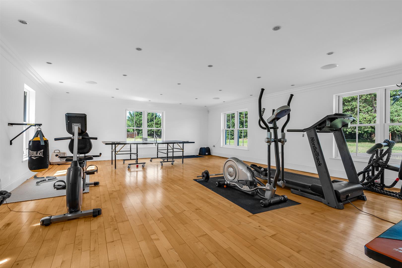 Beyond the utility room/laundry is a useful external door opening into the rear garden, and at the end of the hallway is the exercise suite. A substantial gymnasium/games room occupies the main space, extending to nearly twenty-eight feet in length, which enjoys abundant daylight and natural ventilation thanks to the five windows spread around the three outside walls. Next door is a neat shower/changing room that incorporates an indoor sauna and WC.