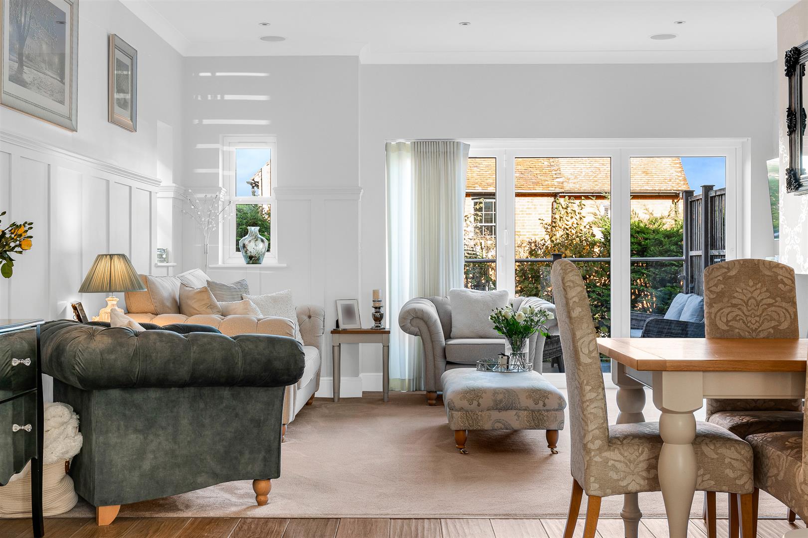 The whole of the rear of the ground floor is given over to a glorious open plan living/dining room, which is a wonderfully elegant space with high ceilings fitted with bespoke, beautifully understated wood panelling around the perimeter walls. It is a large room, certainly, at twenty-three feet long, but of well balanced proportions that make the space fully usable and offers great choice as to how it is configured and furnished to meet your needs. Easily able to accommodate a substantial dining suite whilst still leaving abundant space for multiple sofas, chairs and other occasional furniture besides, this is a flexible and adaptable room that is ideally suited for spending time together as a family and for entertaining guests, with the added bonus of a seamless connection out onto the stunning terrace through the full width bi-fold doors. Two additional windows in the rear corner of the room are attractive styling details as well as adding even more natural daylight to the room, and the contemporary log burner set into the clean, modern fireplace adds character, atmosphere and cosy winter warmth.