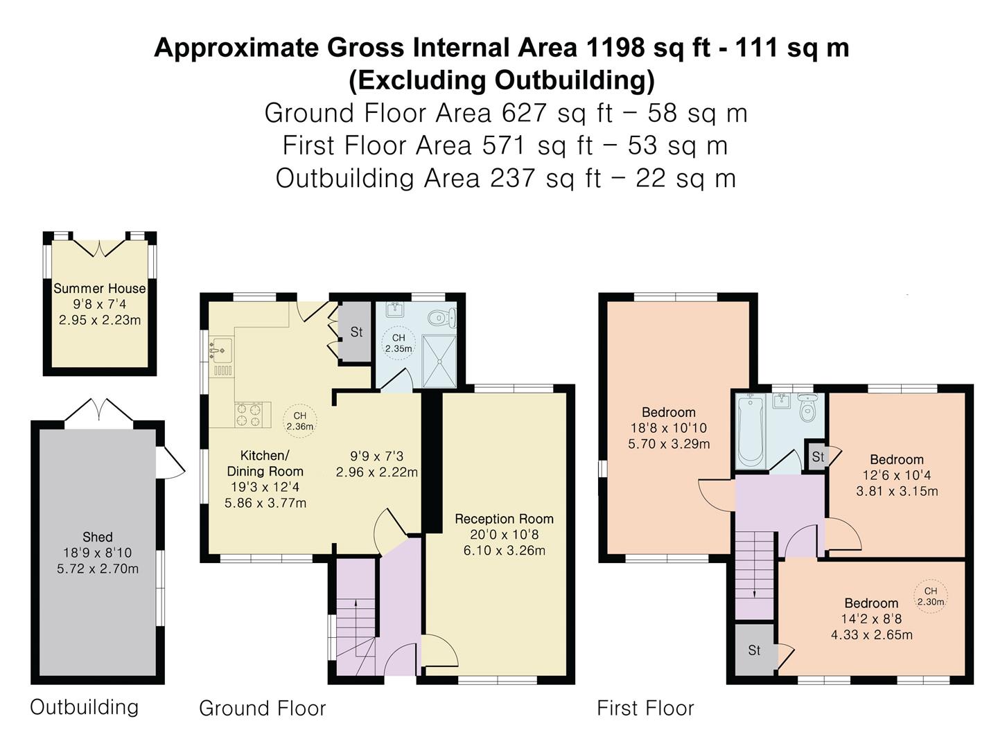 The house is at the end of a small quiet cul-de-sac and conveniently features a private parking bay to the rear, which is situated in front of the property’s garage. Additionally, adjacent to the garage is a communal car park. The rear garden encompasses a very large corner plot, much wider than the house, which has paths meandering through it leading to a large shed, a lovely summer house and a fabulous raised decking covered terrace.