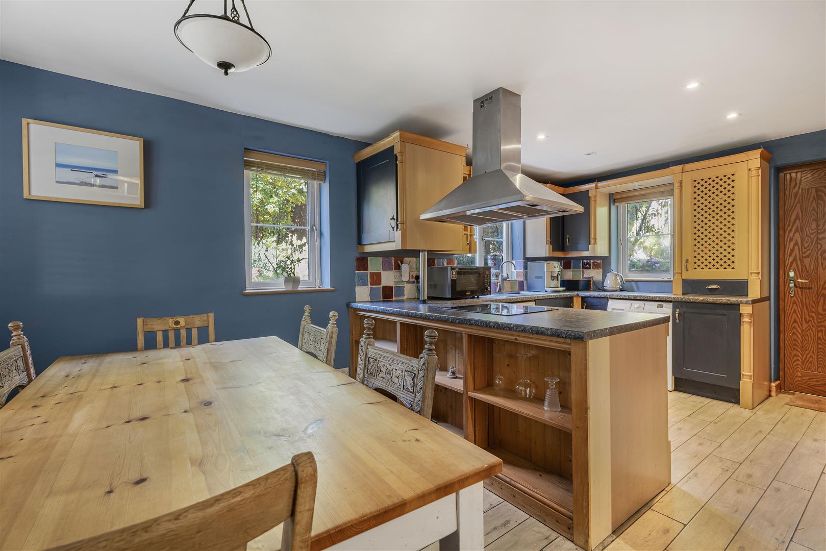 The rear of the entrance hall opens through a door into the corner of the kitchen/breakfast room, which is a superb 'L' shaped space extending open plan from a useful lobby/office area into the dining space and on into the fitted kitchen at the rear of the house. The room is a really good size and shape, allowing a natural delineation of the various areas, yet retaining the free flowing open connections between them. There are no fewer than four large windows spread around the three outside walls, which allow natural light to completely fill the room throughout the day. There is ample space for a large dining suite in the area to the front, neatly separated from the kitchen by an island with an integrated hob and oven, with an extractor unit above. The remainder of the neat kitchen area is ergonomically laid out and features a range of wall and floor mounted cupboards offering generous storage space and plenty of food preparation work top area, as well as designated spaces for some free standing appliances. At the rear of the kitchen is a nice window with views out into the garden alongside a doorway opening out to the rear.