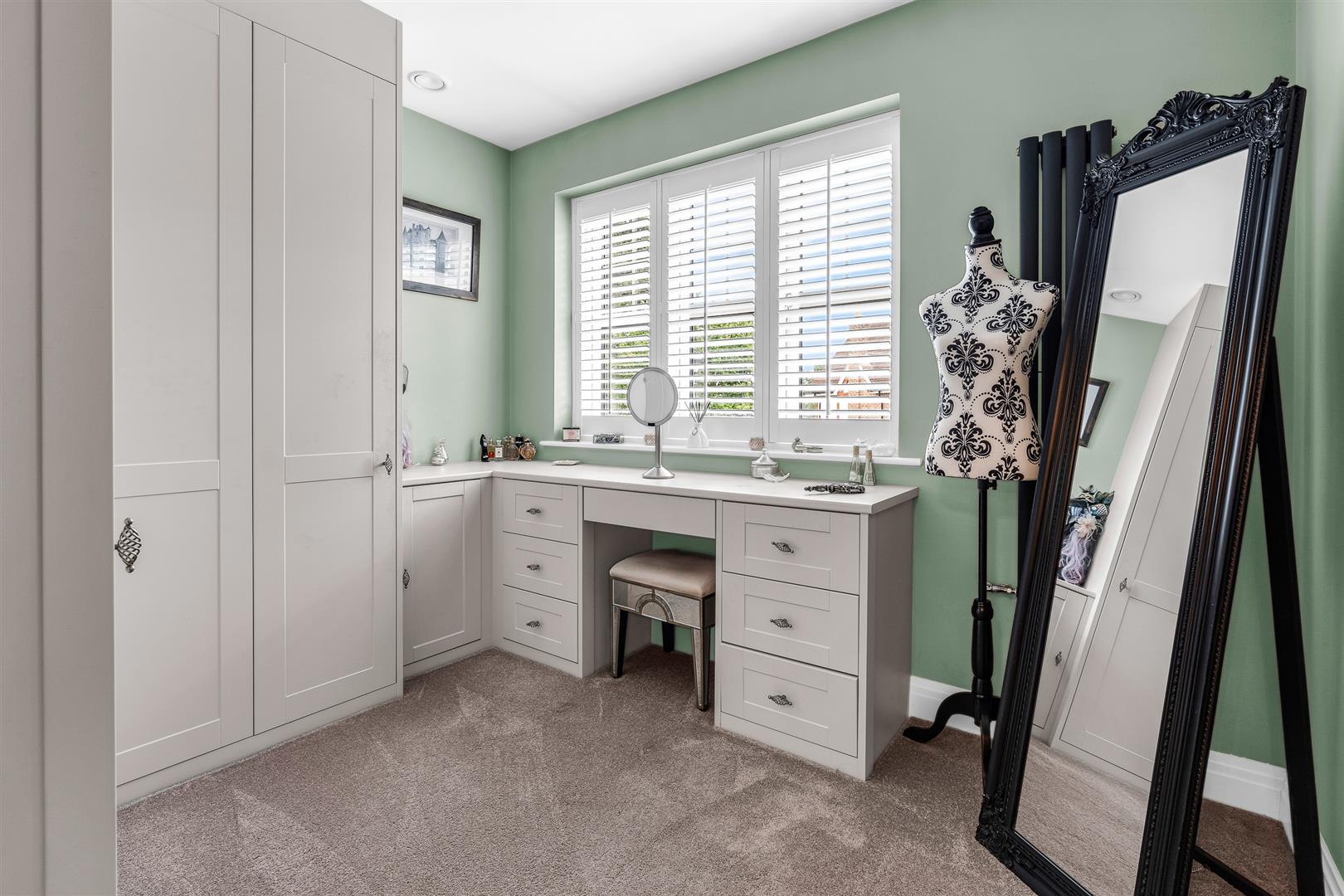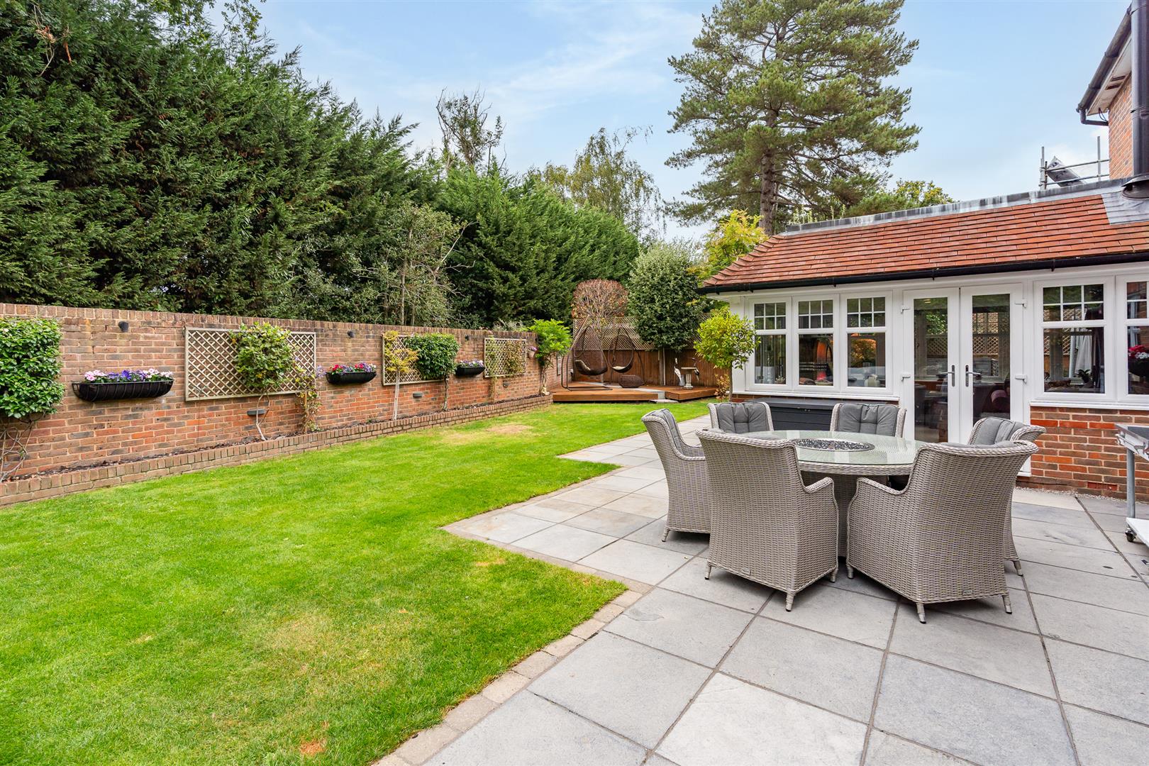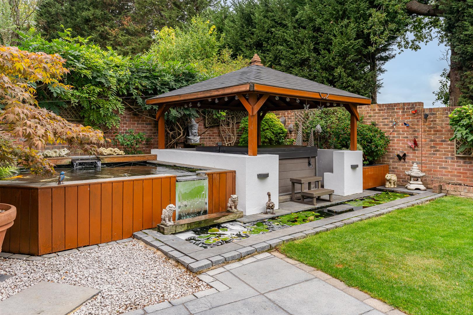 A beautiful decking area, natural slate patio and bespoke water features including a pond, Award Leisure hot-tub and solid wood pagoda complete the space. The garden benefits from a northwest-facing orientation, capturing the evening sunset through the trees. A red cedar clad garden shed with electrics and double glazing provides useful and secure additional storage.