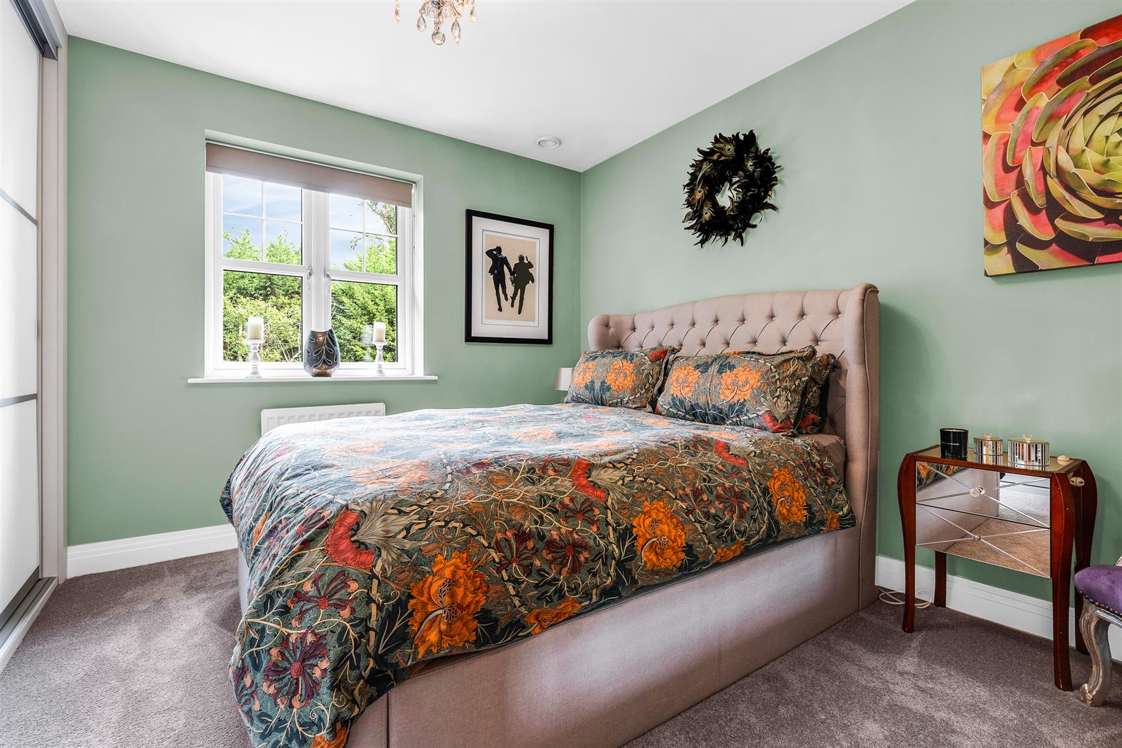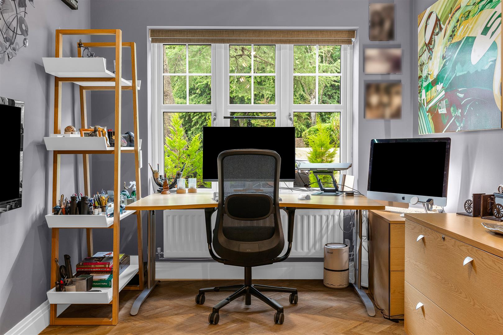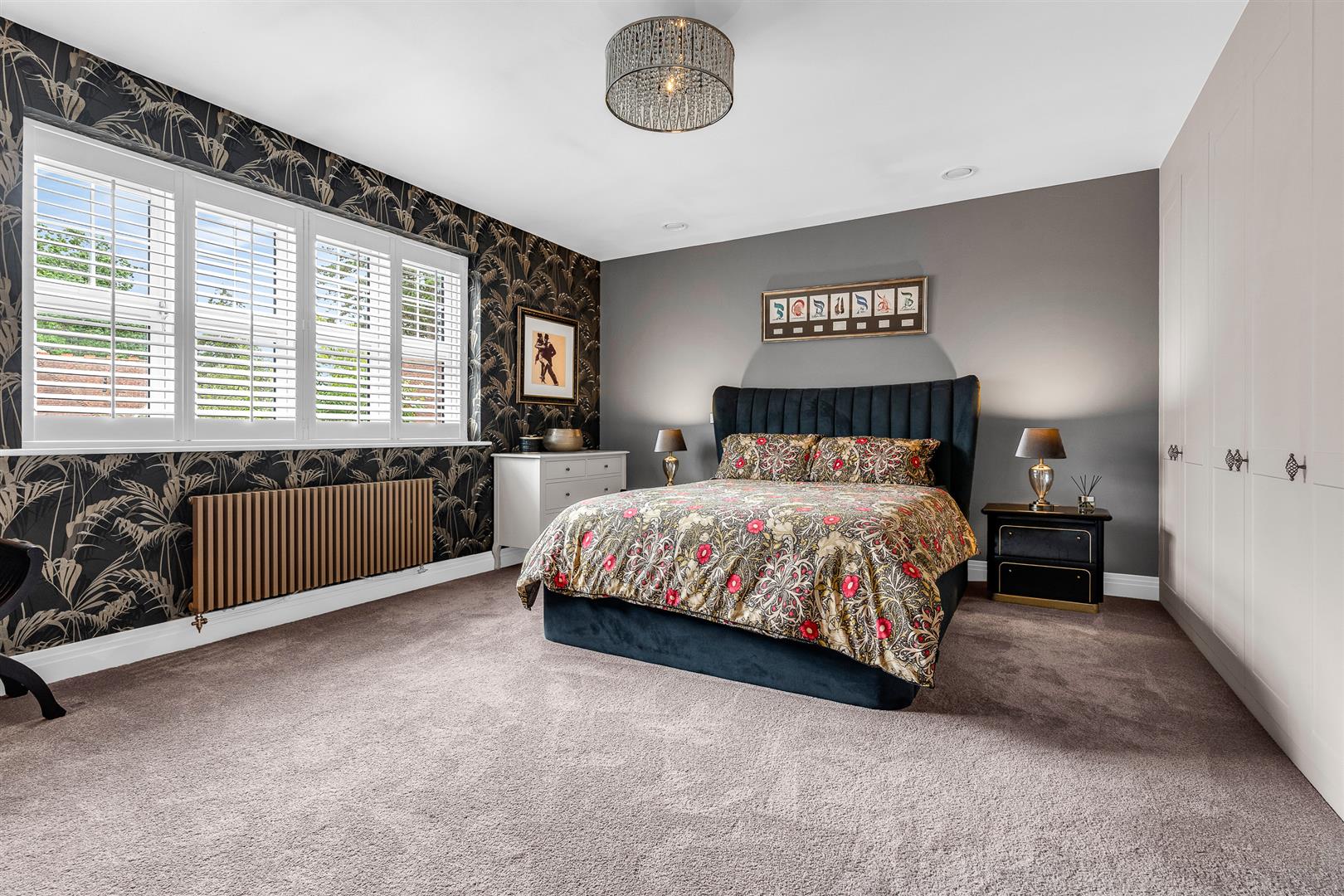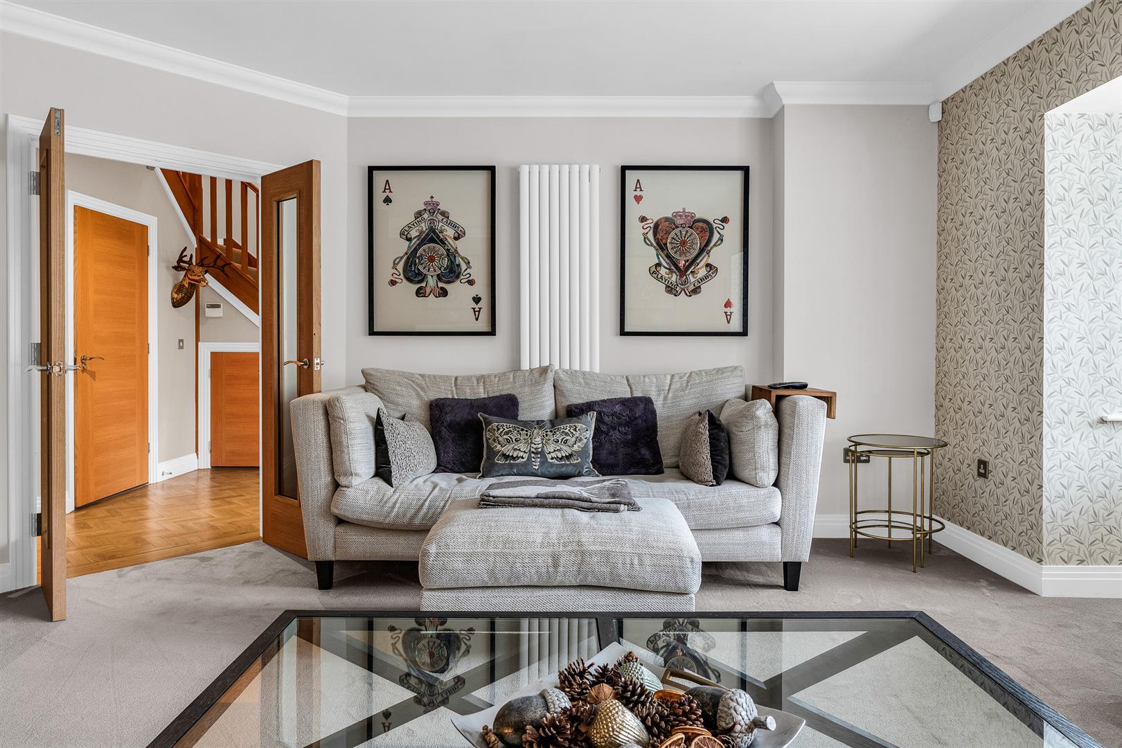 Internally, the house is beautifully presented following a full redecoration in 2021. Elegant touches such as Designer’s Guild wallpapers, new Amtico flooring to the kitchen, hall and study and new luxury carpets with deep underlay throughout, plus designer lighting and radiators, offer both style and comfort. A spacious entrance hall leads to a large bay-fronted living room with bespoke fitted wood shutter blinds and a versatile office/study with uninterrupted views.