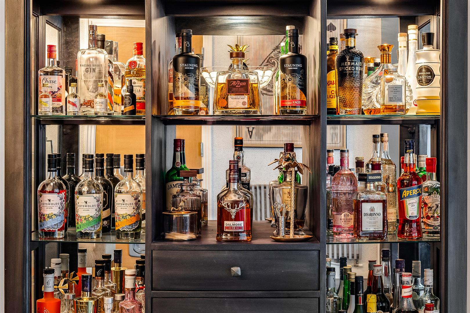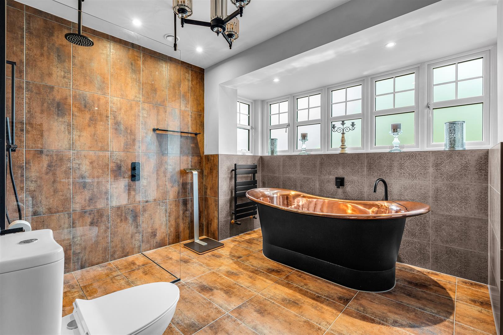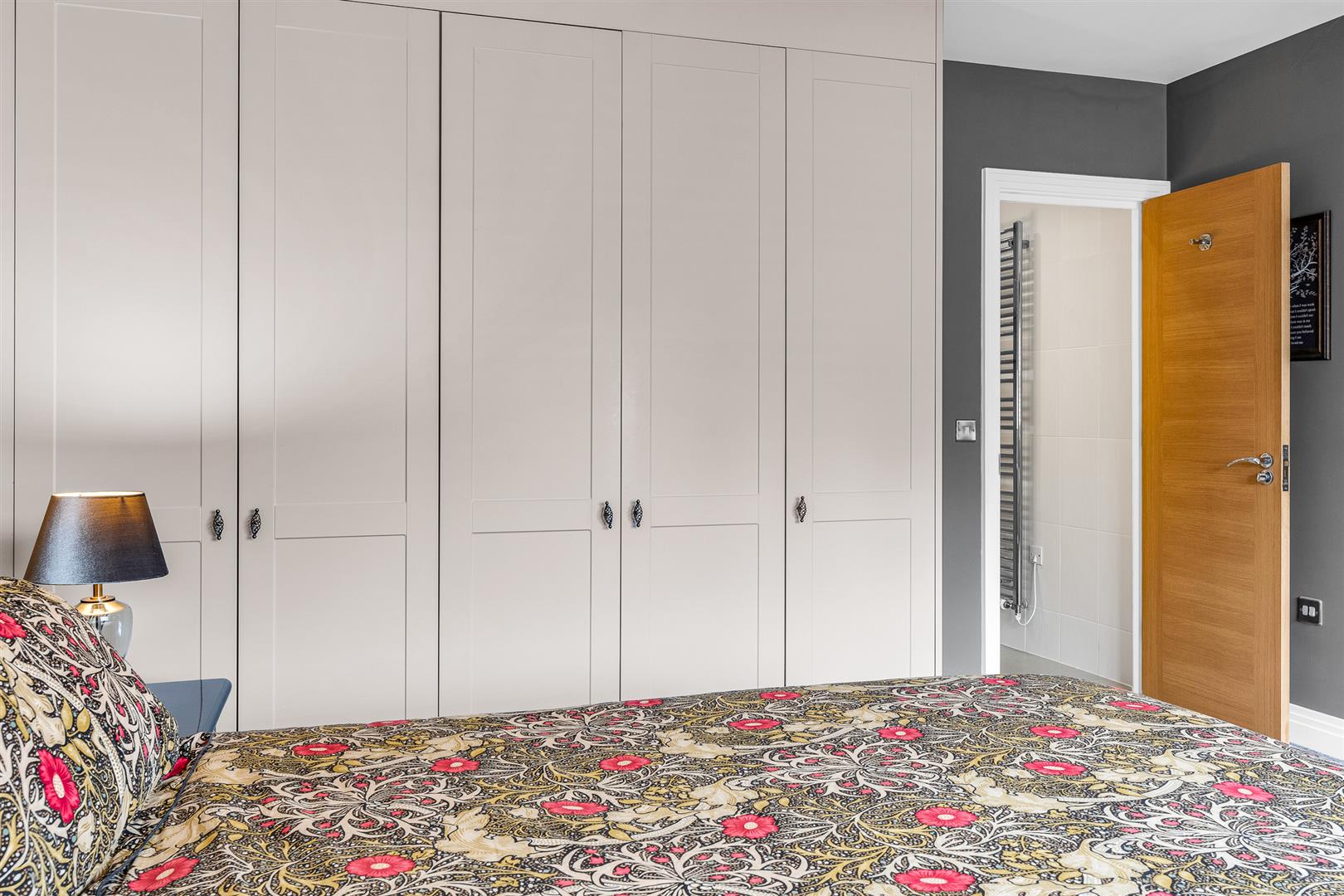 Upstairs, the property provides five bedrooms, most include fitted wardrobes. The master suite benefits from Daikin air conditioning and an ensuite. One of the bedrooms has been converted into a fully fitted dressing room. The main bathroom has been completely refitted to a luxury standard and features a freestanding copper bath by London Encaustic, modern fixtures and sleek tilework.