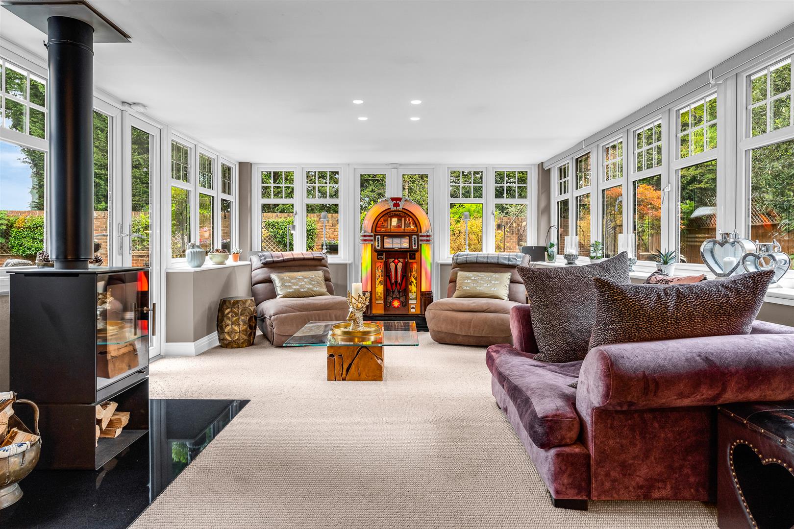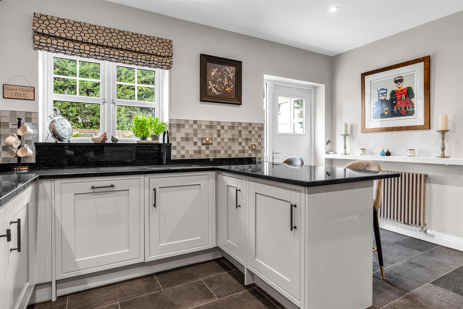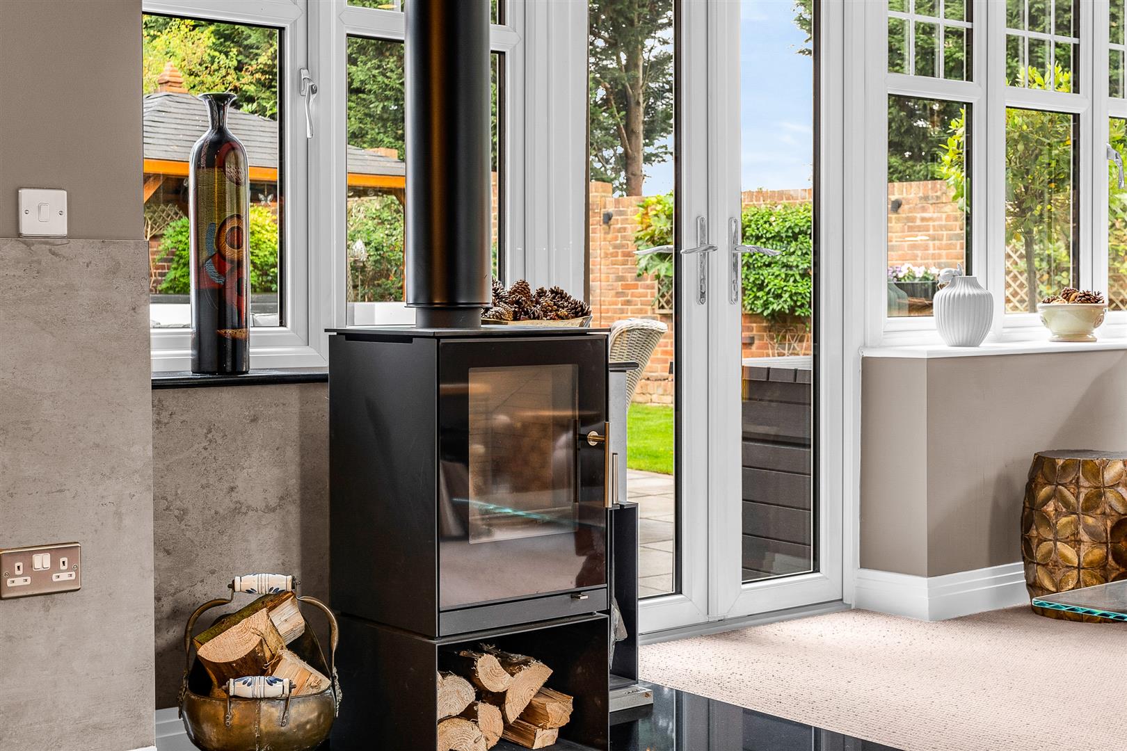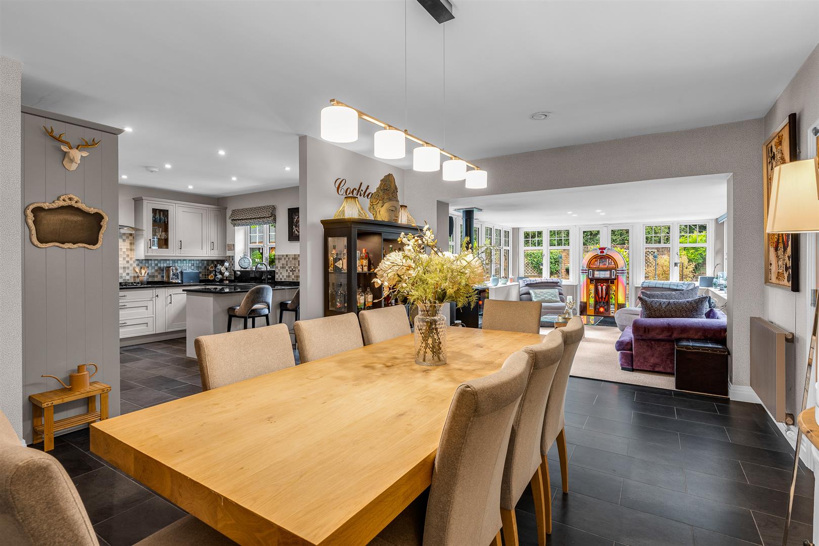 At the heart of the home lies a generous open-plan kitchen/dining room, which connects directly to a stunning orangery-style family room complete with a RAIS Q-Tee log burner (installed 2021 with granite hearth). The kitchen has been tastefully updated with new granite worktops, a Villeroy and Boch butler sink, upgraded appliances, including a useful Quooker tap.