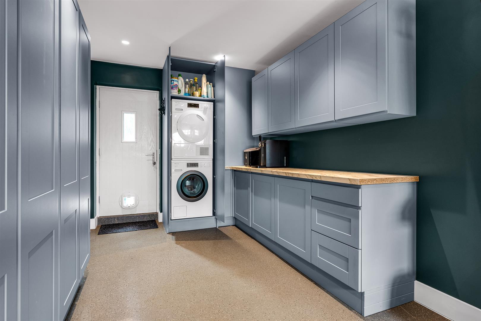 The integral garage has been cleverly divided to create a fully equipped utility/gym area with sleek cabinetry and its own garden access. The garage has been upgraded with new walls and ceiling and a resin coating to the floor, with the ceiling and doors being insulated and ample power points installed, offering excellent functionality.