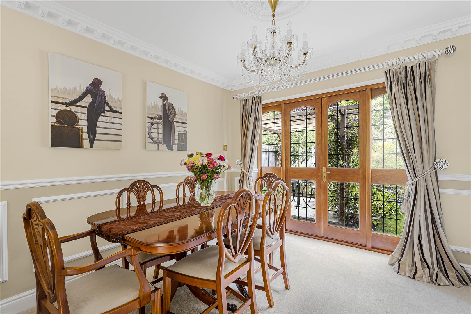 The room is abundantly lit by the lovely glazed French doors opening out into the rear garden, with full height matching windows either side, as well as the superb windows spanning the full width of the front which are set into a lovely bay. An elegant decorative fireplace graces the outside wall, with a marble surround and hearth nicely offsetting the brass edged open grate, a fabulous focal point full of character as well as giving cosy winter warmth. This really is a charming room, with ornate cornices and ceiling roses, as well as dado rails lining the perimeter walls, and is comfortably large enough to accept multiple sofas and chairs as well as a substantial dining suite.