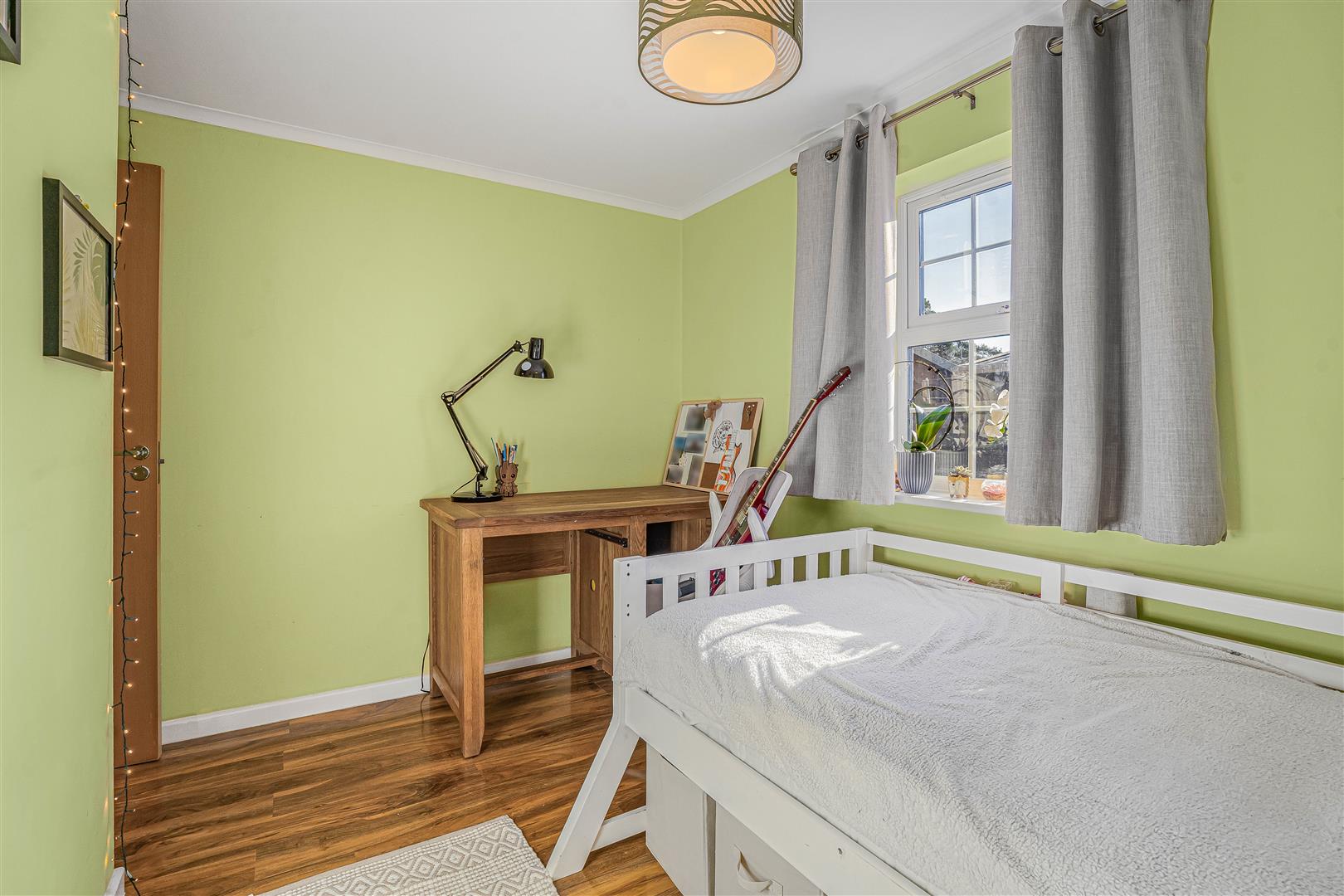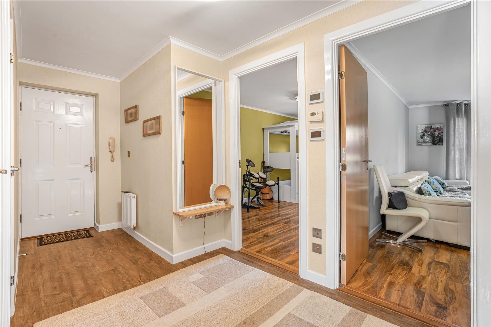 A large central entrance hallway enhances the sense of space and provides additional storage. There are two well-sized double bedrooms, both benefiting from built-in storage solutions, along with a well-appointed family bathroom.