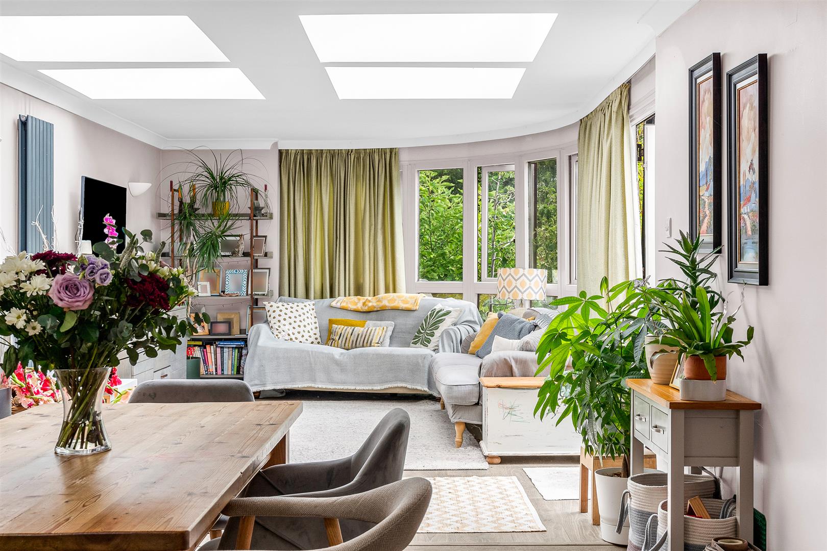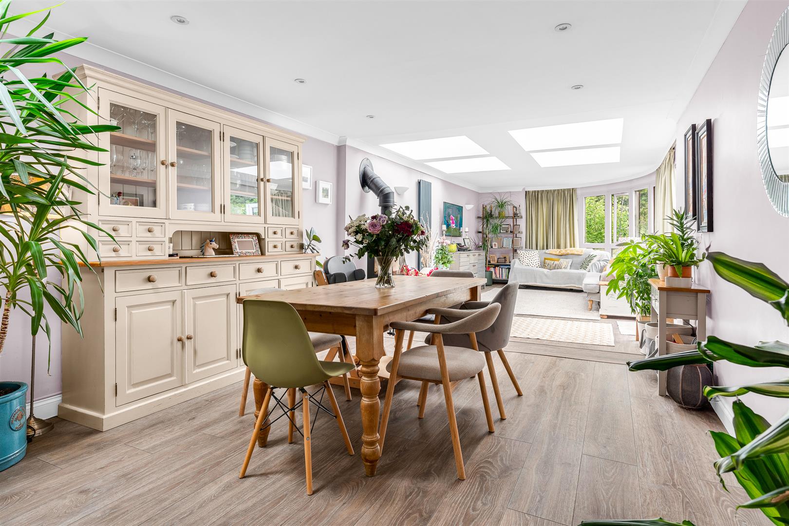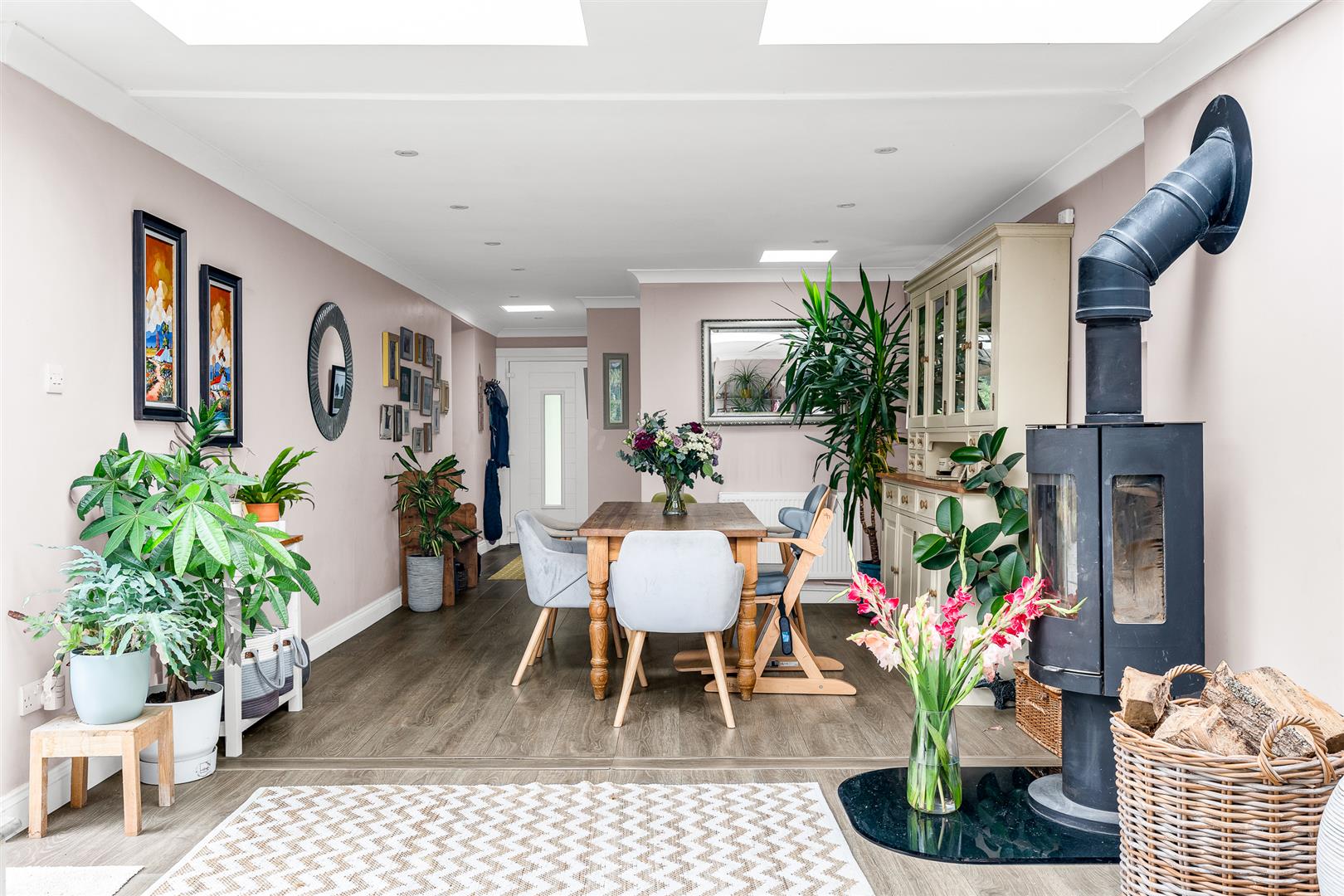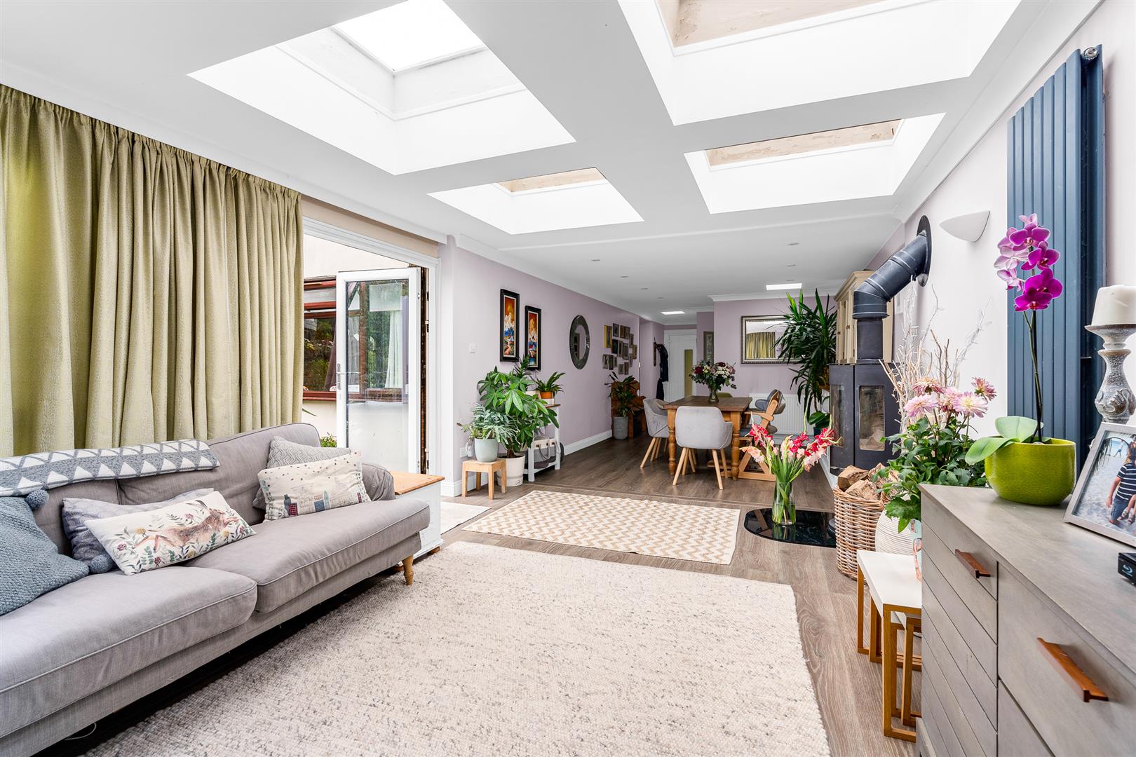 Like the kitchen, the living/dining room benefits from an open connection to the entrance hall, ensuring a really nice free flowing arrangement through the main living areas of the house. This is a stunning room that extends to over thirty-seven feet in length and is absolutely flooded in natural daylight through the four substantial roof lights set into the ceiling above the rearmost part of the room, further enhanced by the light that pours in unhindered through the lovely curved wall of windows at the rear which culminates in a set of glazed French doors that open directly out onto the terrace. Full of style and effortless elegance, with a chic modern log burner taking centre stage, balanced cleverly with a vertical full height contemporary designer radiator, this is just a wonderful place to spend time together socialising and dining with family and friends, and a valuable asset providing a seamless link between the inside and outside when making use of the fabulous outdoor space adjoining it.