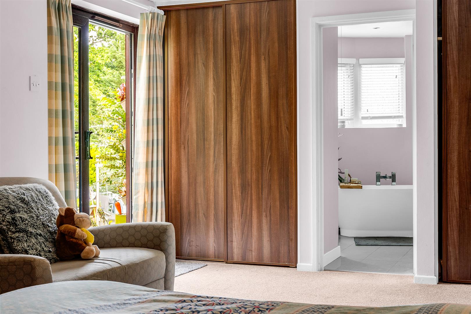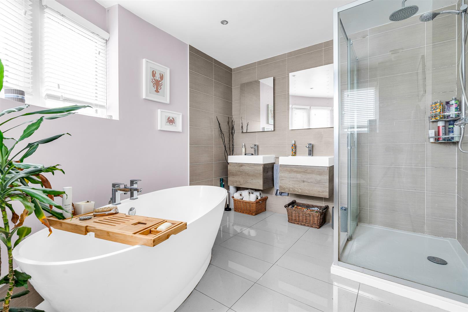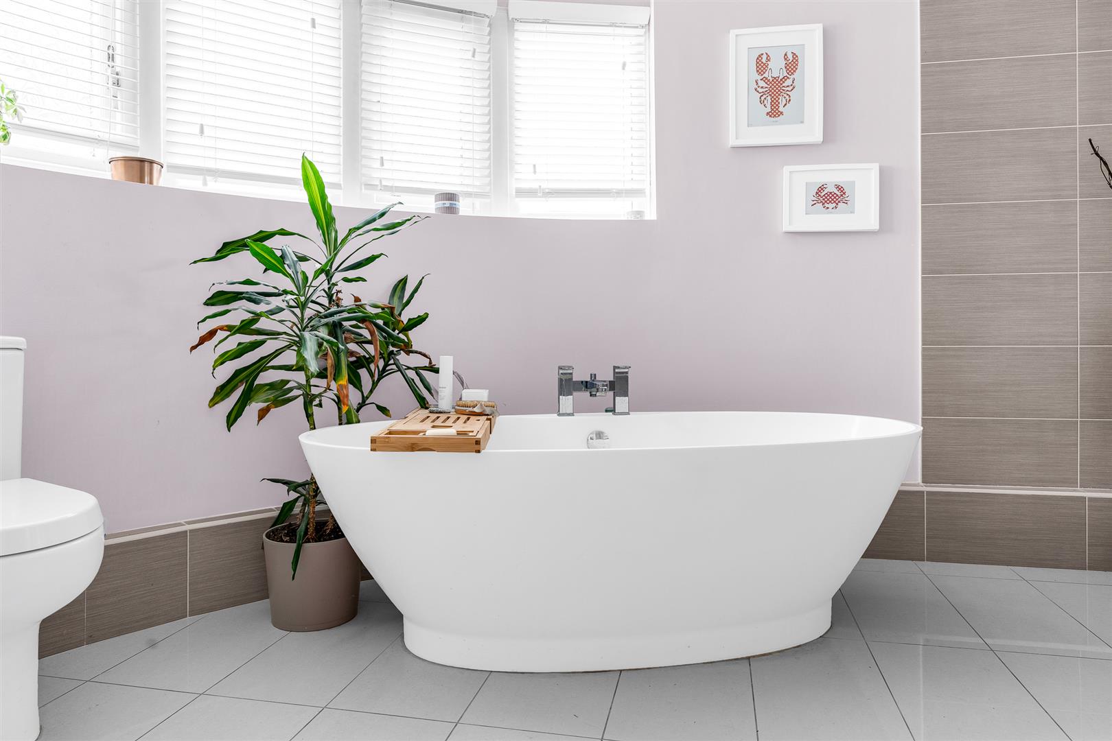 Opposite the kitchen is the family bathroom, which boasts a separate bath and shower and is well positioned to also serve as a convenient guest cloakroom. All four of the bedrooms are doubles in size, with two of them being very large indeed. The front bedroom has a generous en suite shower room installed in a wet-room style, along with a spacious and well proportioned layout, making it easy to configure the room as a mini-bedsit incorporating a range of occasional furniture as well as a desk if needed and casual seating, which would make it perfect for a young adult still at home or an older relative living with you, either of whom would benefit from some independence and privacy but still enjoy the support and company of the family on a day to day basis. The principal bedroom is quite superb, generously sized and fitted with a range of built-in wardrobes, and a stunning en suite bathroom with twin sinks, a separate shower and a stylish free standing bath set beneath multiple windows that follow the graceful curve of the outside wall. To top it all off there is a set of sliding glass doors that open directly out onto the rear terrace, a simply delightful arrangement.