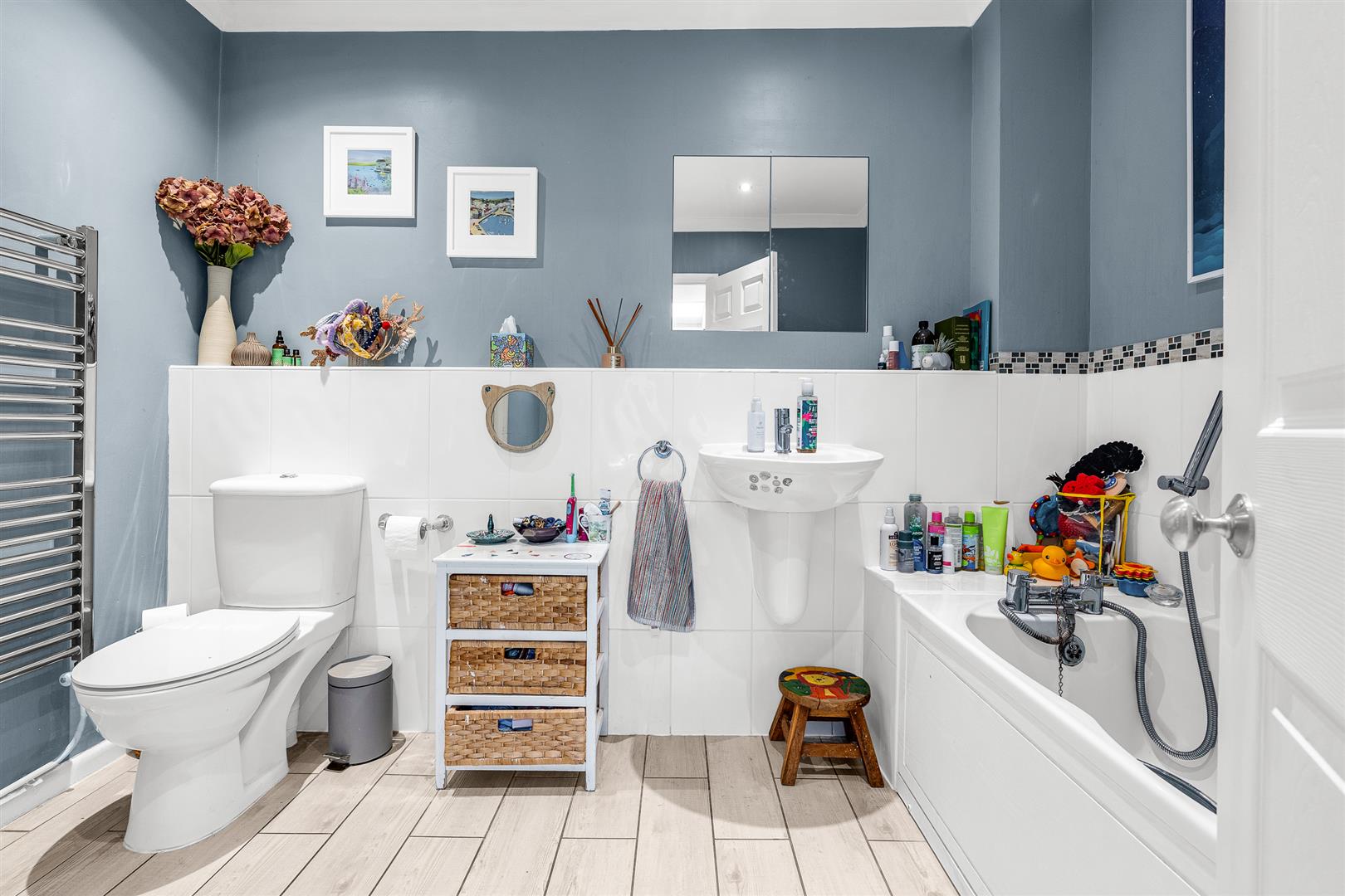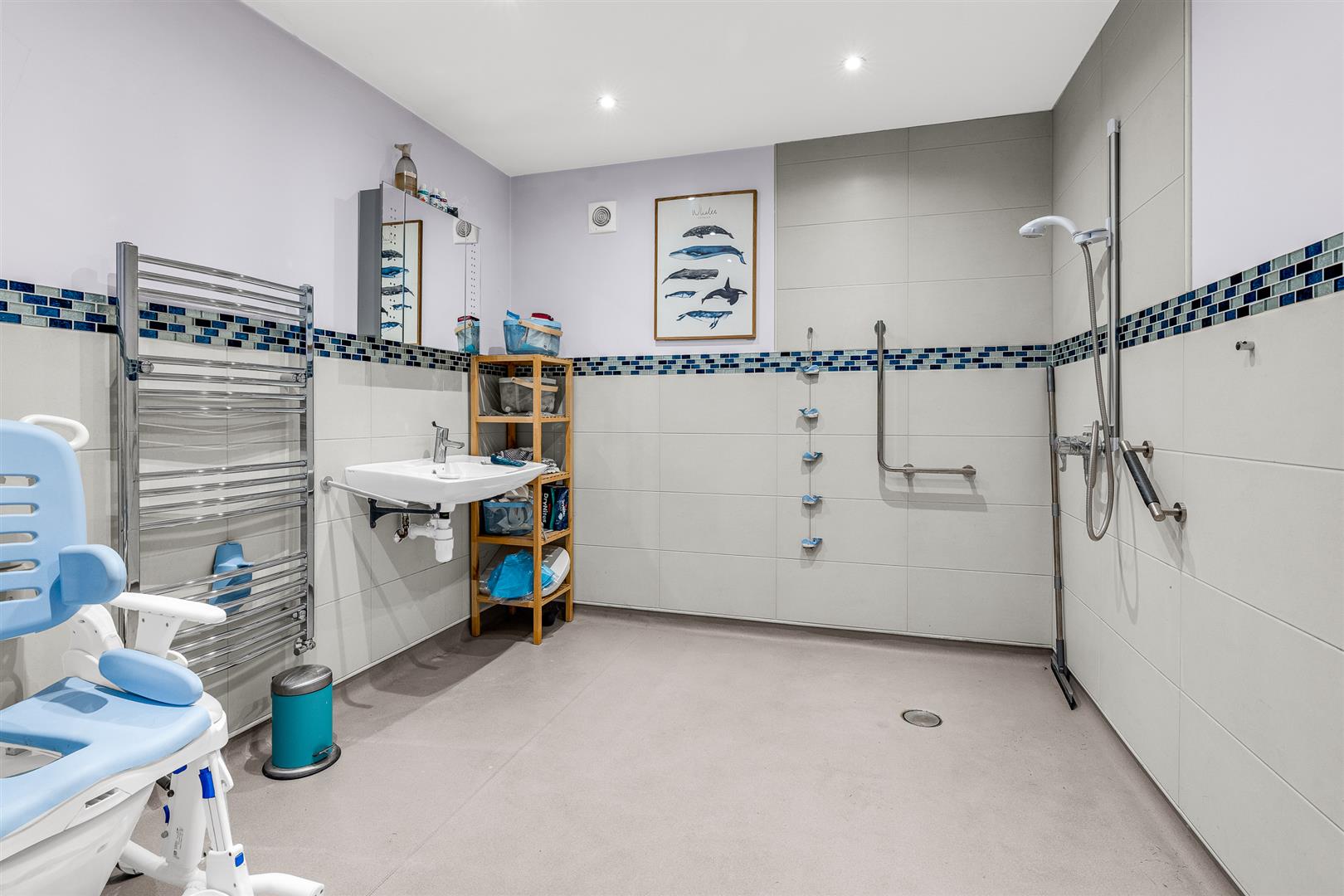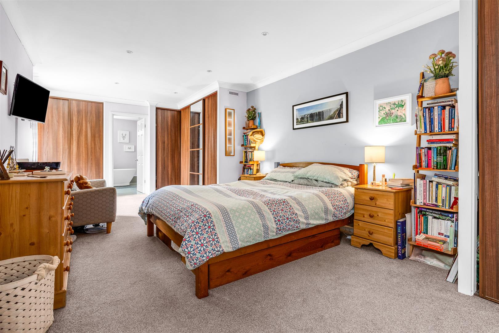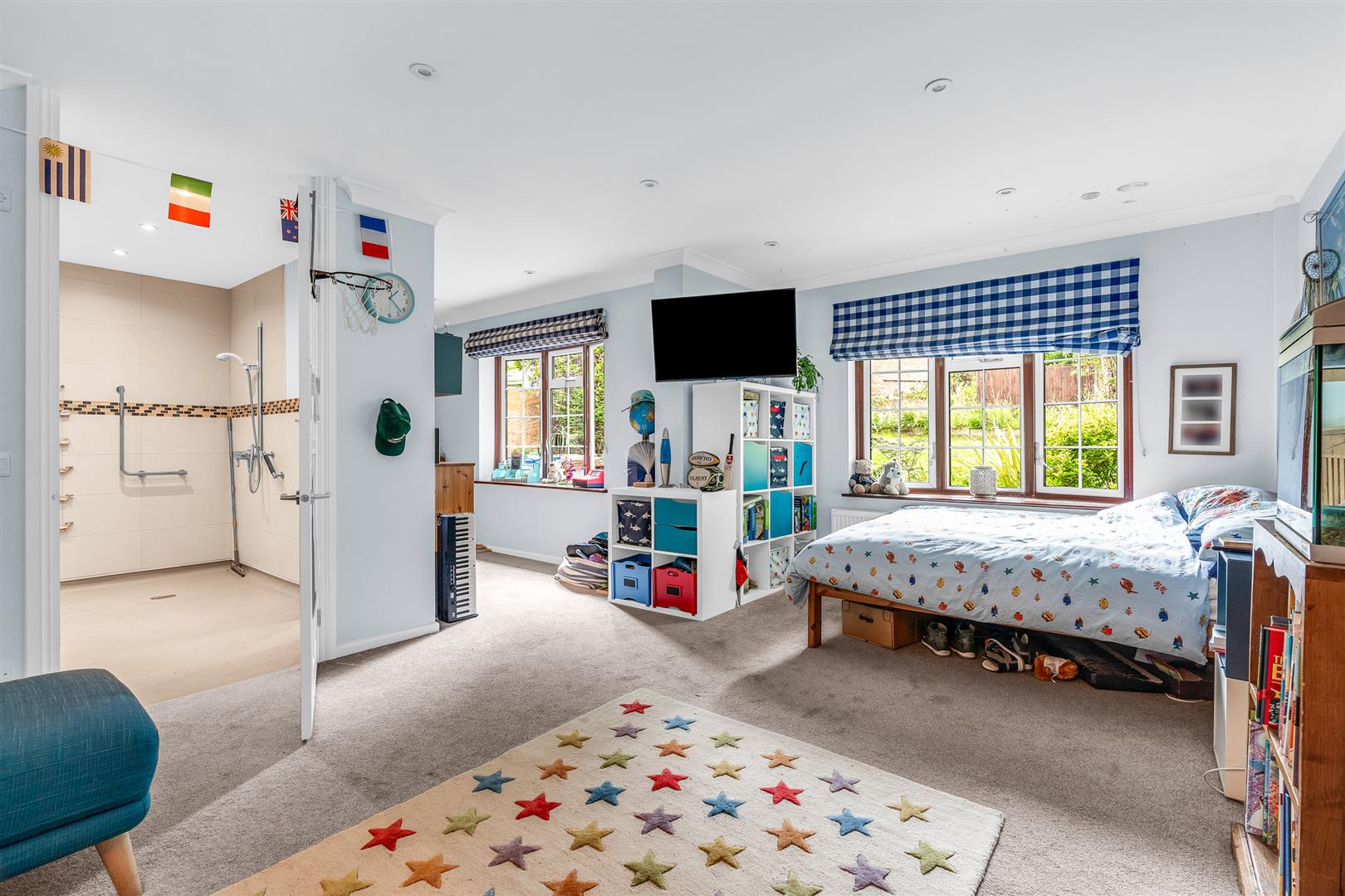 Opposite the kitchen is the family bathroom, which boasts a separate bath and shower and is well positioned to also serve as a convenient guest cloakroom. All four of the bedrooms are doubles in size, with two of them being very large indeed. The front bedroom has a generous en suite shower room installed in a wet-room style, along with a spacious and well proportioned layout, making it easy to configure the room as a mini-bedsit incorporating a range of occasional furniture as well as a desk if needed and casual seating, which would make it perfect for a young adult still at home or an older relative living with you, either of whom would benefit from some independence and privacy but still enjoy the support and company of the family on a day to day basis. The principal bedroom is quite superb, generously sized and fitted with a range of built-in wardrobes, and a stunning en suite bathroom with twin sinks, a separate shower and a stylish free standing bath set beneath multiple windows that follow the graceful curve of the outside wall. To top it all off there is a set of sliding glass doors that open directly out onto the rear terrace, a simply delightful arrangement.