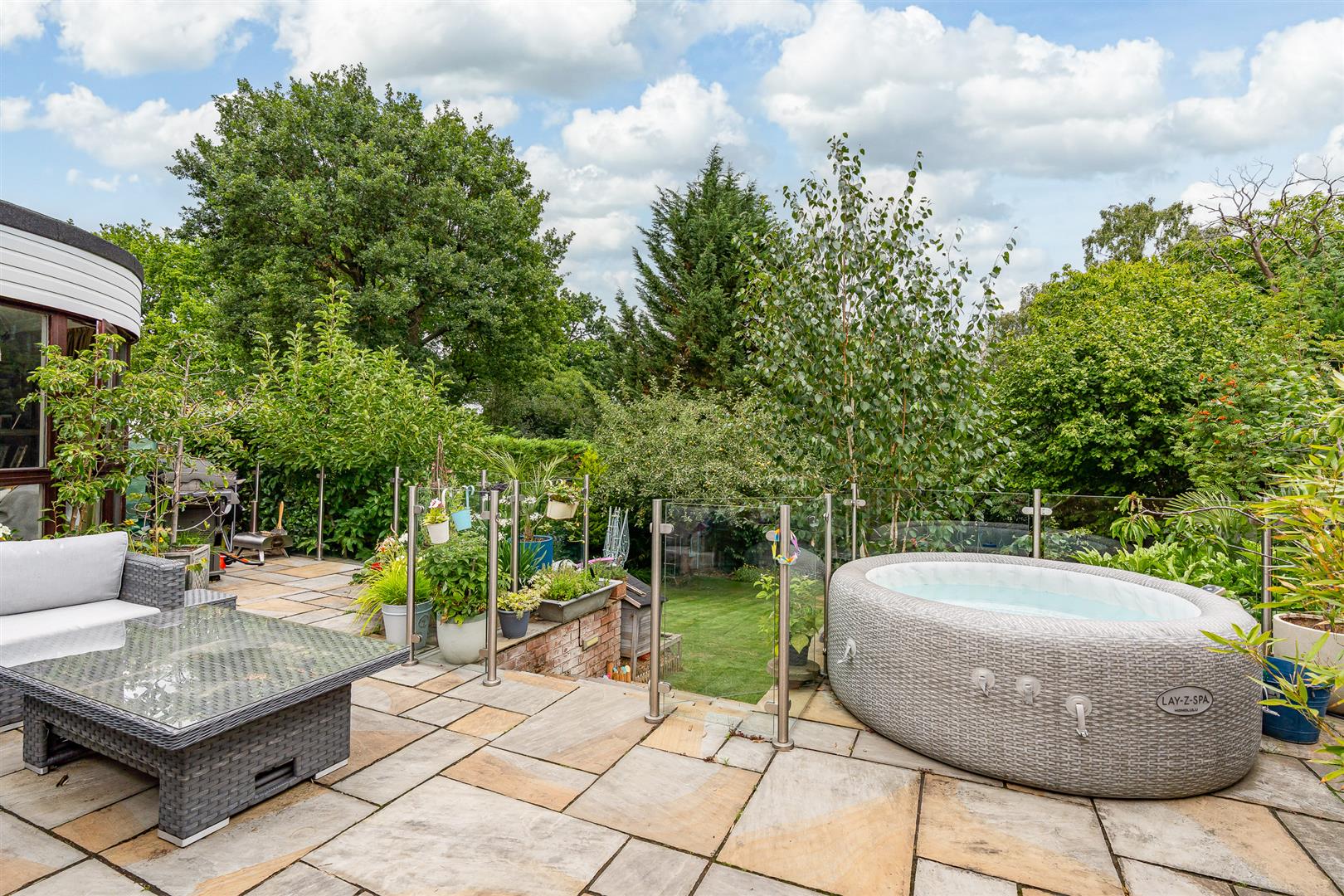 The low level visual impact from the front gives the overall impression of open sky and vibrant green planting, which presents as a skilfully curated collection of hugely varied colour and shape in the borders that encircle the front lawn. Alongside the lawn is a block paved driveway in a decorative herringbone pattern that provides ample off street parking as it leads up to the front of the house and the adjoining garage/workshop. To the rear, the architect has cleverly created a natural sheltered courtyard area between the extended curved walls of the principal bedroom and the living/dining room, which is perfectly occupied by a spacious paved terrace that extends the full width of the garden. Slightly elevated due to the gentle natural slope of the grounds, the view across the garden from the terrace is celebrated by the use of glass infill panels at the terrace's edge, with a short flight of paved steps leading down to the lawn below. The garden is a good size and completely unoverlooked, with densely planted borders edging the lawn and natural hedge boundaries. This is an ideal family garden, both pet and child friendly, with a wonderful patio area that will provide a tranquil space to relax, dine and socialise in utterly delightful surroundings for you, your family and your guests. Conveniently just a short walk from the house is easy access into Harmer Green Wood as well as Mardley Heath, offering picturesque leafy walking routes.