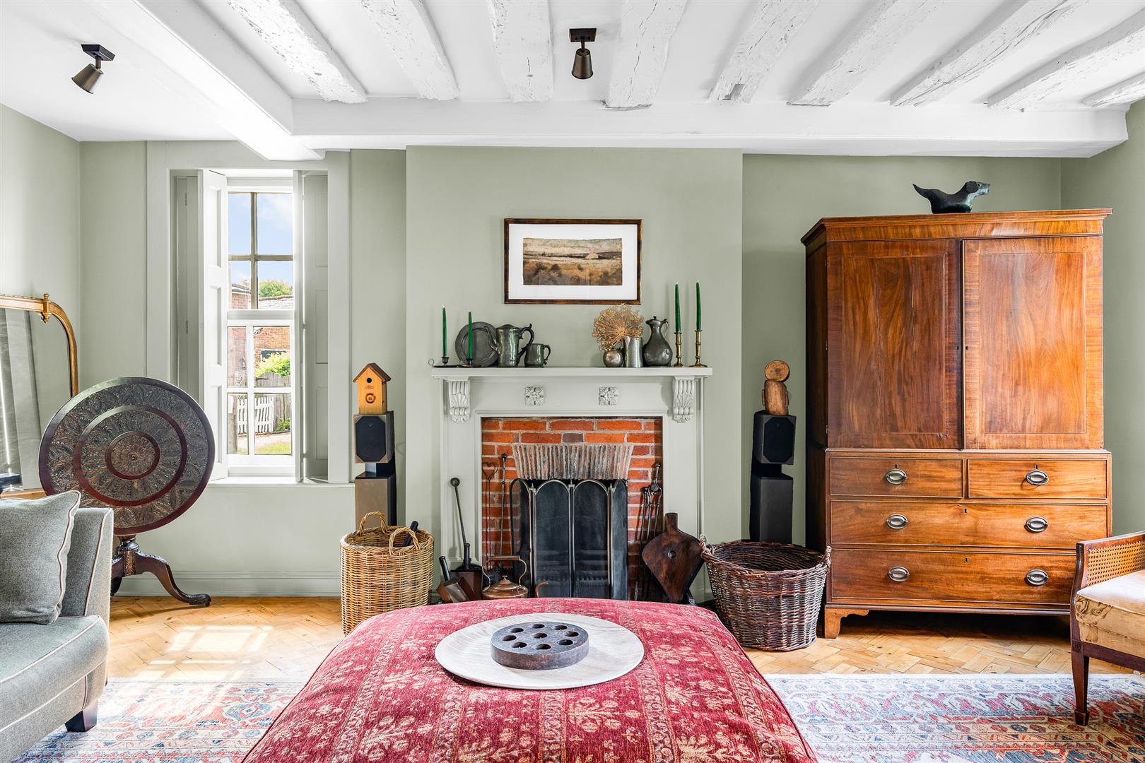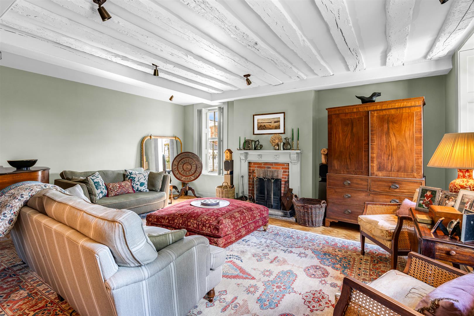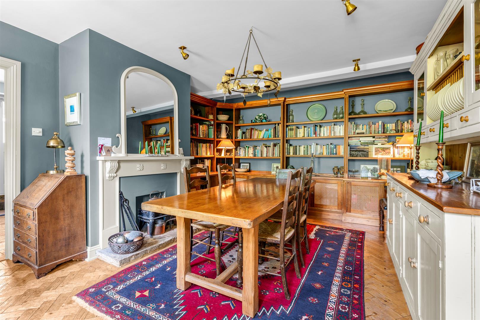 The living room is a wonderful space, abundantly lit by two large front facing windows that reach right up to the exposed beam ceiling, as well as a further side facing window in the corner beyond the fireplace. Period features abound, including the parquet floor, beamed ceiling, lovely exposed brick and tile fireplace set within an ornate mantelpiece, and original wooden shutters on all of the windows. The generous size and perfectly square shape make this an easy room to layout and furnish, a simply wonderful room in which to spend time relaxing as a family or entertaining guests.