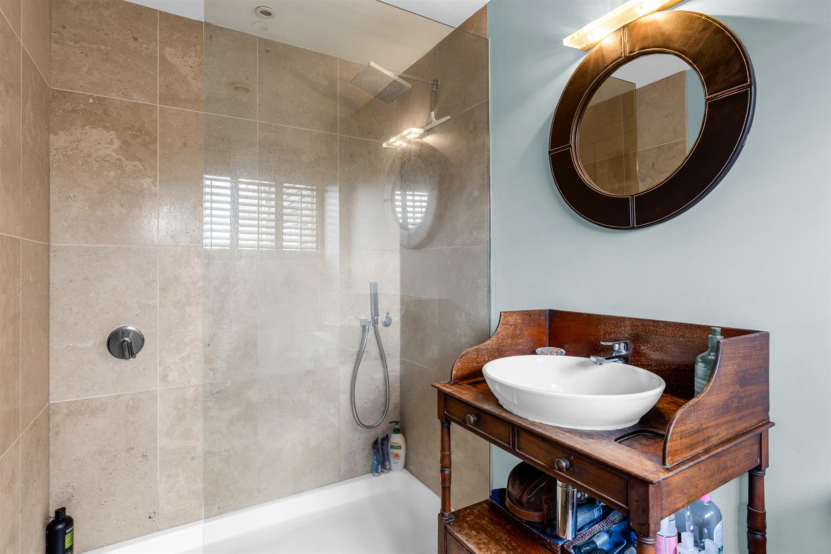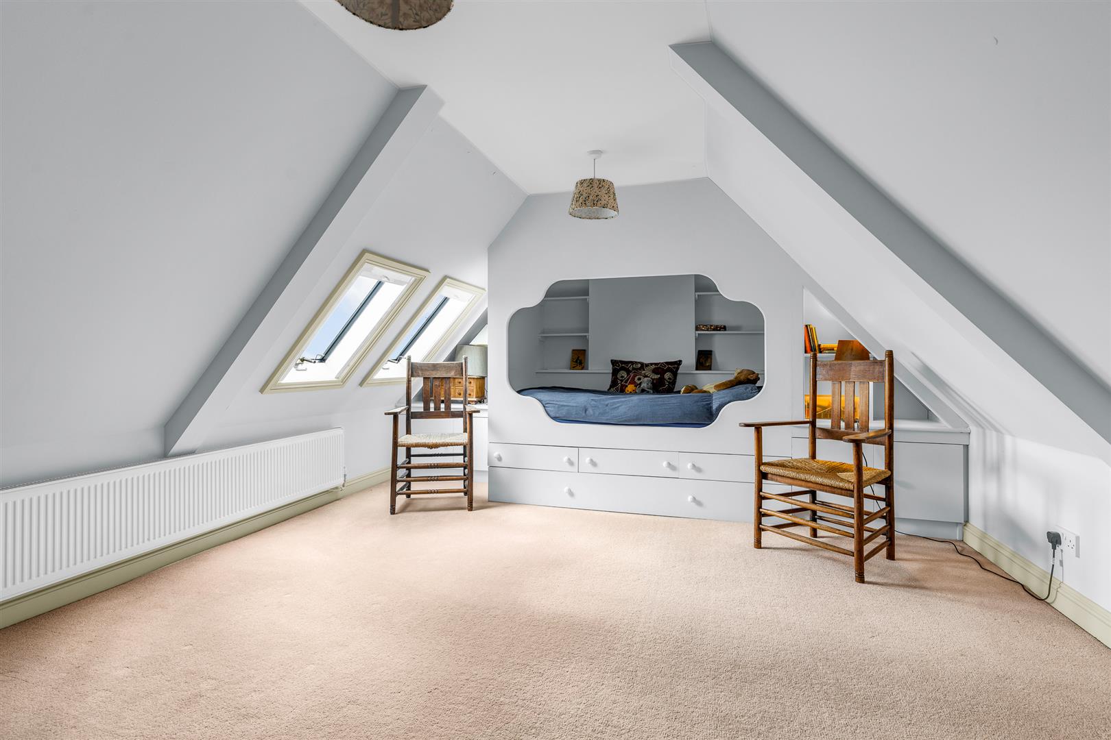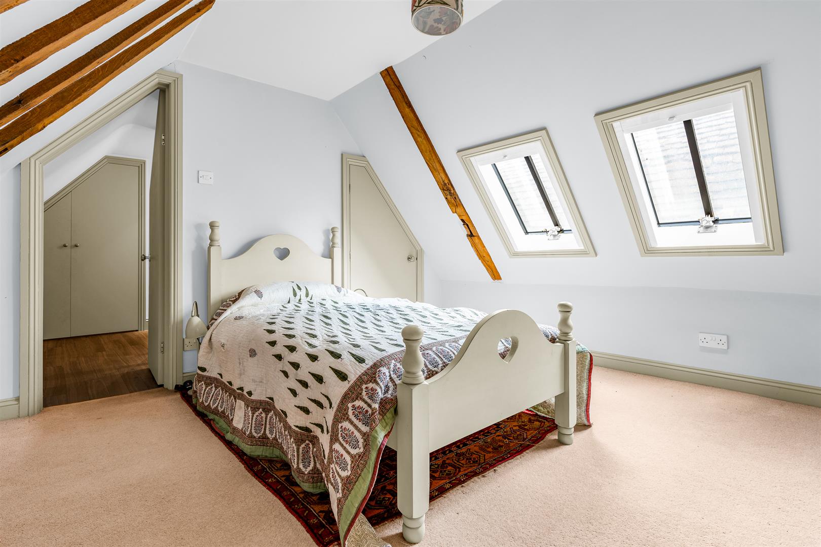 The living room is a wonderful space, abundantly lit by two large front facing windows that reach right up to the exposed beam ceiling, as well as a further side facing window in the corner beyond the fireplace. Period features abound, including the parquet floor, beamed ceiling, lovely exposed brick and tile fireplace set within an ornate mantelpiece, and original wooden shutters on all of the windows. The generous size and perfectly square shape make this an easy room to layout and furnish, a simply wonderful room in which to spend time relaxing as a family or entertaining guests.