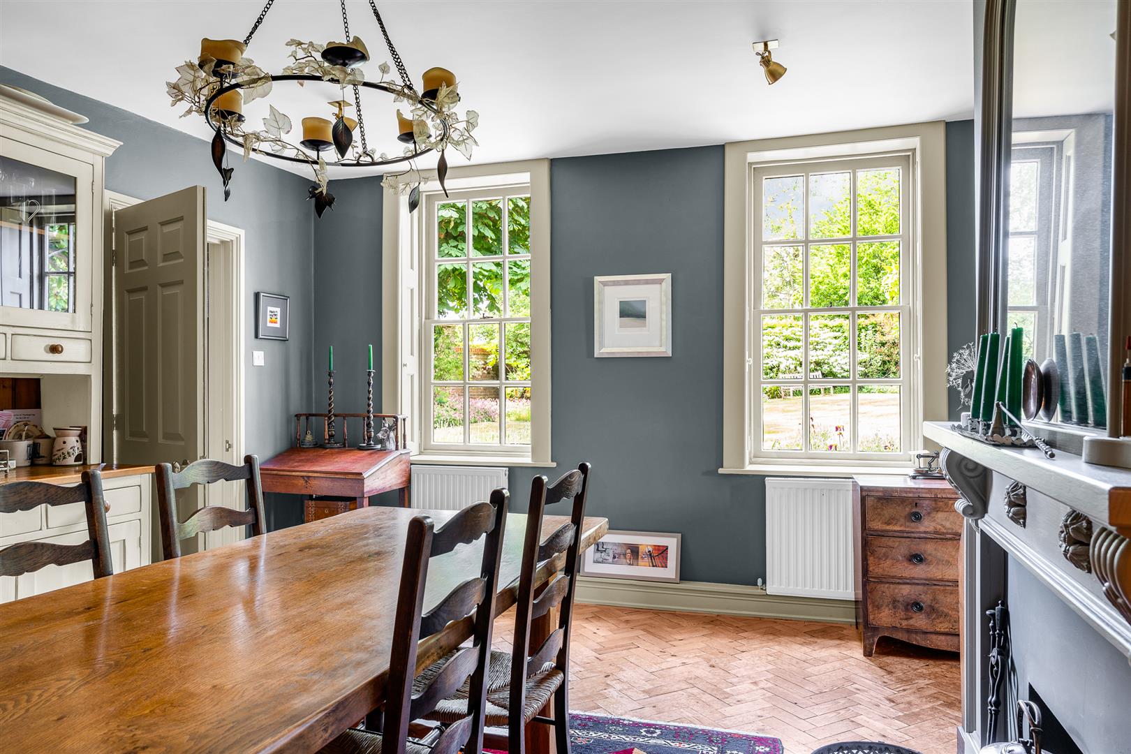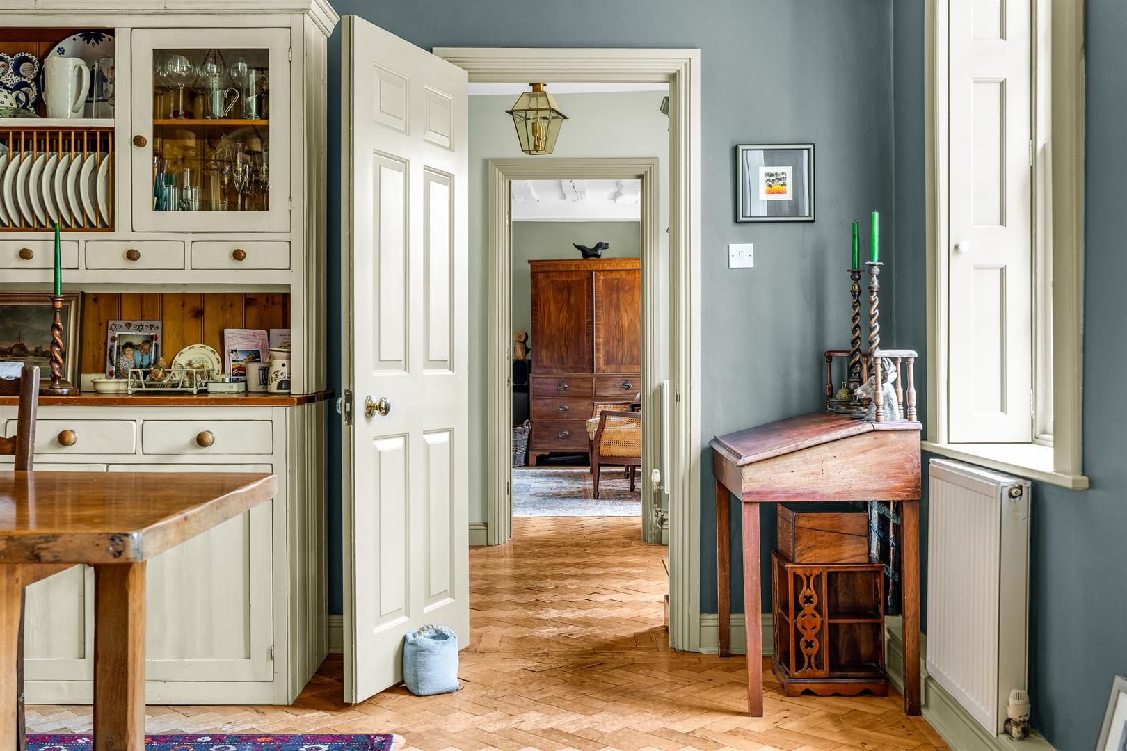 Across the entrance hall is the dining room, another lovely light, bright room thanks to the two large sash windows looking out over the garden. Comfortably large enough to accept a substantial dining table and chairs and still leave room for your visitors to mingle, this is a super place to host stylish dinner parties with the decorative fire place providing a lovely focal point, set above a stone hearth sitting harmoniously alongside the wooden parquet floor.
