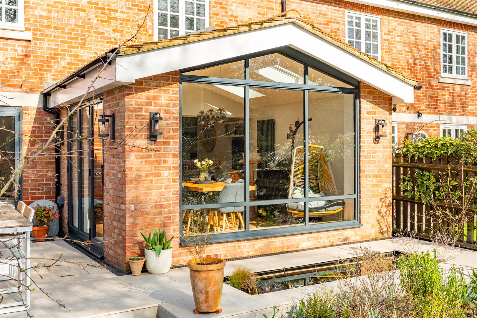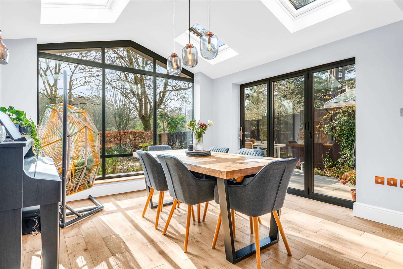 The adjoining dining room is quite simply stunning, with a full wall of glass to the rear that allows the daylight and the country views to pour in unhindered as it stretches up into the open pitch of the gable end. There is a direct connection out onto the generous patio through a three panel set of bi-fold doors to the side, and no fewer than four large Velux windows set into the ceiling. Combining the enormous glass area with the south-west facing aspect of the room means that describing the space as being flooded in natural daylight feels like a ridiculous understatement. This really is a room that celebrates all of the benefits of a conservatory without any of the drawbacks, it's an absolute triumph of design.