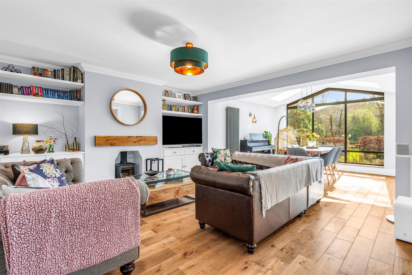 The front facing kitchen is a premium quality bespoke installation presented in absolutely immaculate condition, and abundantly equipped with a full complement of floor and wall mounted fitted cupboards providing more than ample storage space, along with a comprehensive range of integrated appliances with a designated space within the design for a free standing double fridge freezer. The spacious worktop stretches around the perimeter and extends out into a neat island, providing a convenient breakfast bar that sits four/five people. The living room is a really good size and enjoys a nicely balanced shape, endowing it with a high level of flexibility as to how you configure and furnish the generous space available, and is flooded with light from the openly connected dining room to the rear. Comfortably large enough for multiple sofas and chairs, it boasts a wonderful feature fireplace at the centre of the outside wall occupied by a modern log burner, with bespoke fitted cupboards and shelving built into the recesses on either side. This is a great room in which to spend time together as a family and for entertaining guests, with an easy flow between it, the adjacent connecting rooms and the entrance hall.