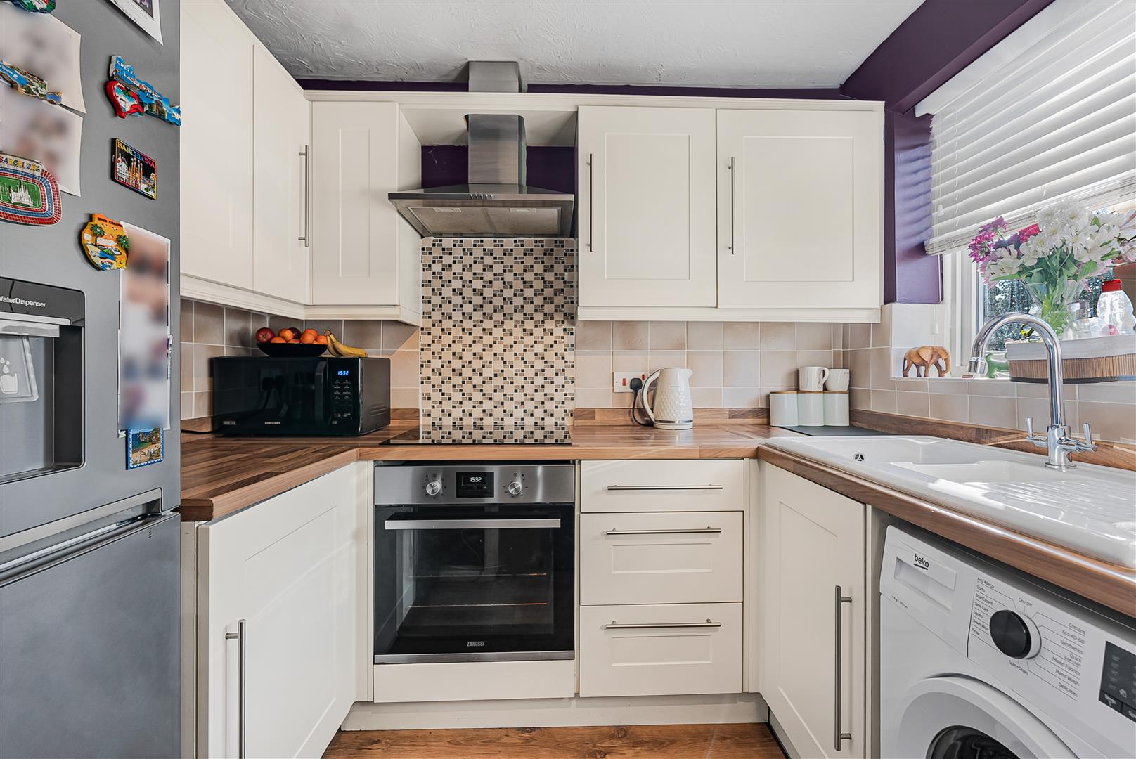 The kitchen is really well lit from a large window looking out over the front garden, with a clever layout that makes best use of the open plan entrance to really maximise the space. Compact but well designed, there is a comprehensive array of wall and floor mounted cupboards fitted around the perimeter walls that offer plentiful storage capacity and ample worktop area, keeping everything you might need close to hand. Integrated within the cabinets is an oven and hob with an extractor above, along with planned in spaces for a free standing washing machine and a full height fridge/freezer plumbed in for a water cooler/ice maker.