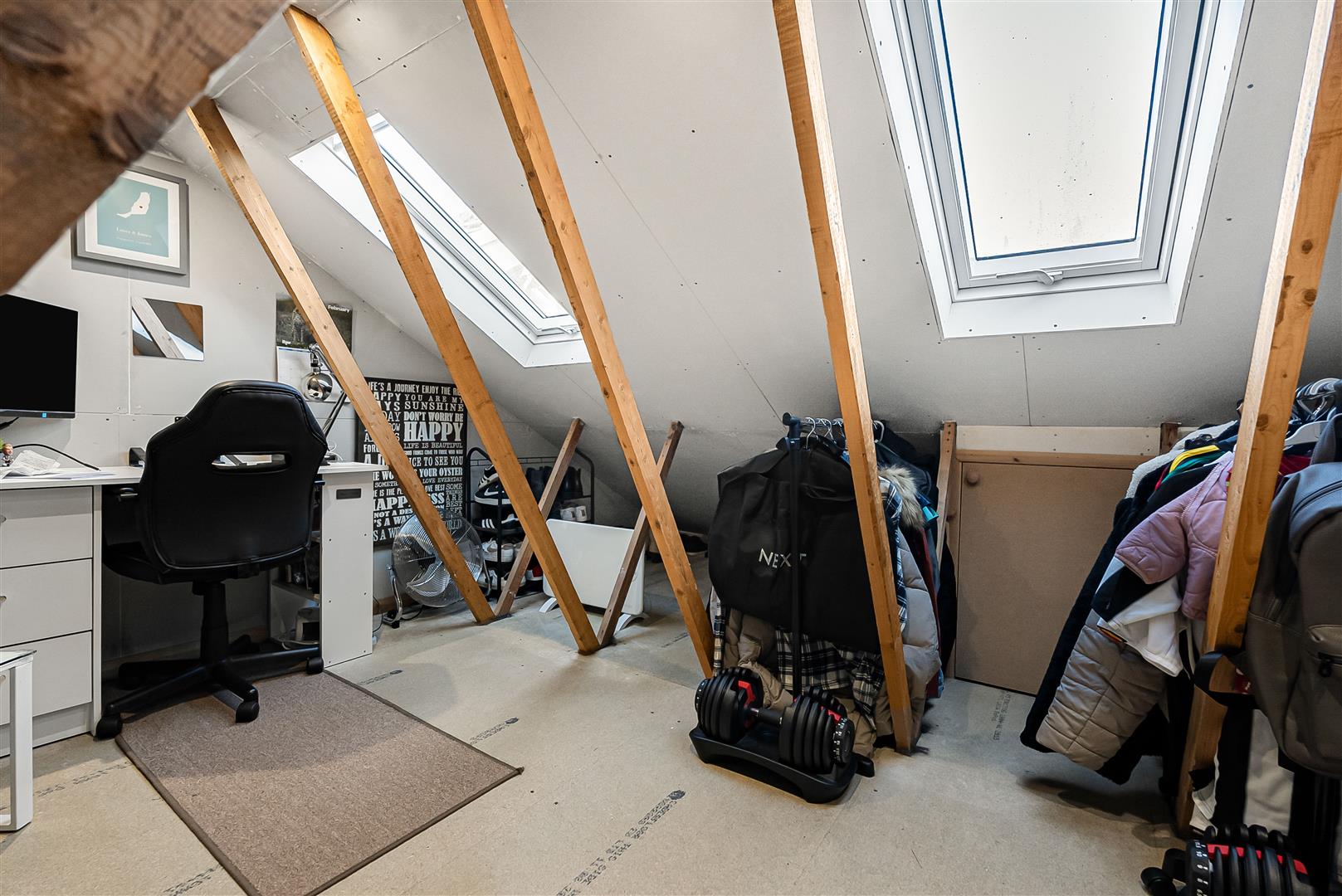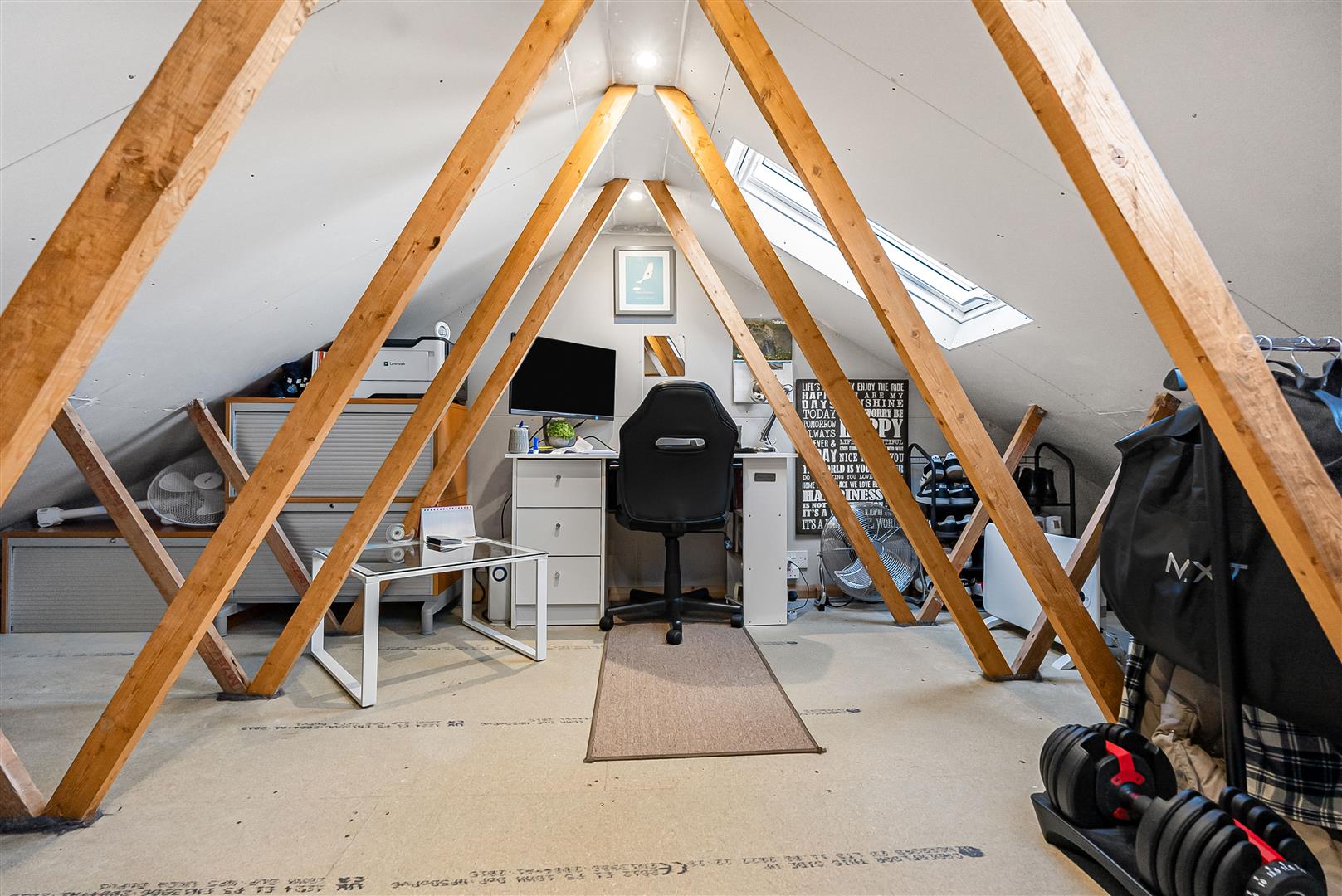 Upstairs the central hallway leads to each of the two bedrooms and the fully tiled bathroom which boasts a ‘P’shaped bath with a shower attachment and screen fitted above it. The principal bedroom is a good sized double and benefits from a whole wall of built-in wardrobes. The loft space has been fully boarded and lined, and fitted with light, power and two Velux roof light windows, making it a completely usable room, an extremely valuable addition.
