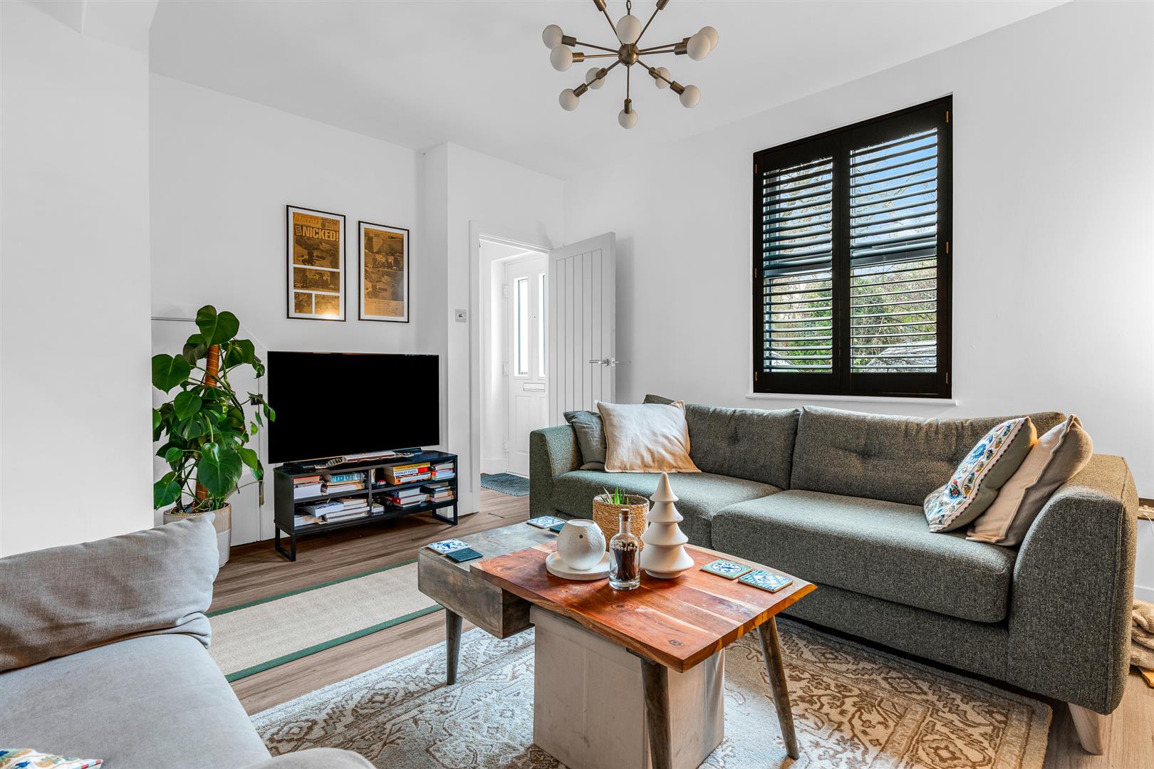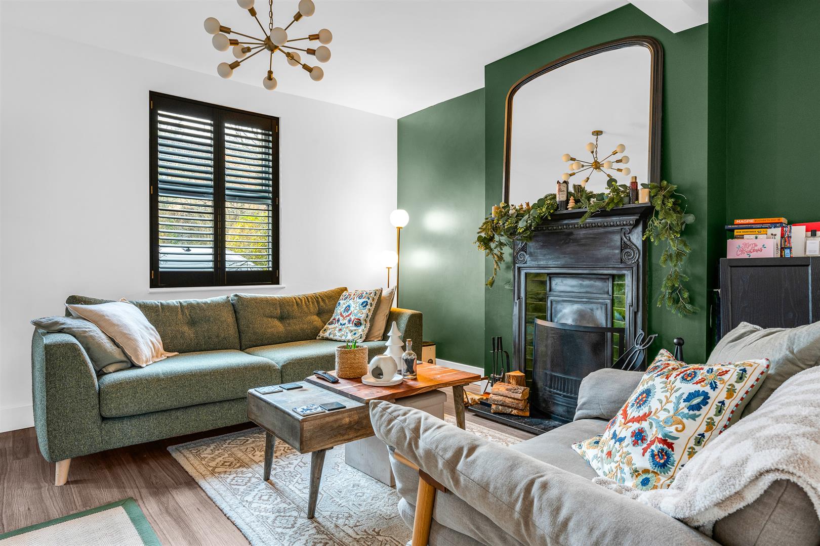 The living room is generously proportioned and beautifully arranged, offering a highly functional space centred around a striking iron fireplace, creating a warm and inviting focal point. Abundant natural light floods the room through an impressive front-facing window, enhanced by elegant adjustable wooden shutters that combine both style and practicality.